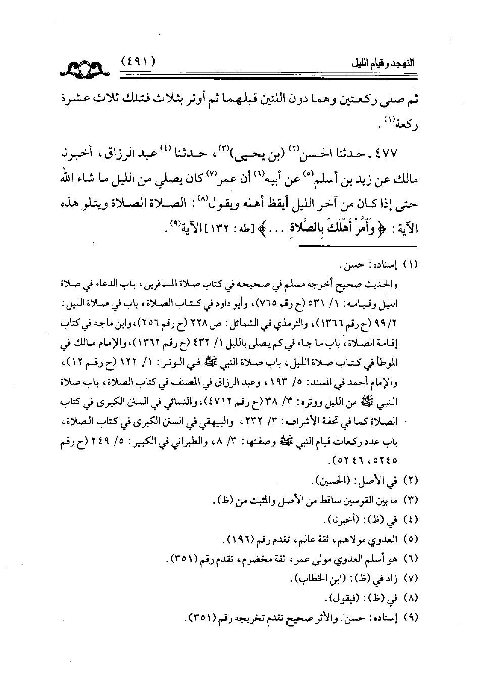 477 - حدثنا الحسن بن يحيى حدثنا عبد الرزاق أخبرنا مالك عن زيد بن أسلم عن أبيه أن عمر كان يصلي من الليل ما شاء الله حتى إذا كان من آخر الليل أيقظ أهله ويقول الصلاة الصلاة ويتلو هذه الآية ( وأمر أهلك بالصلاة . . . . . ) طه 132 الآية // إسناده حسن //