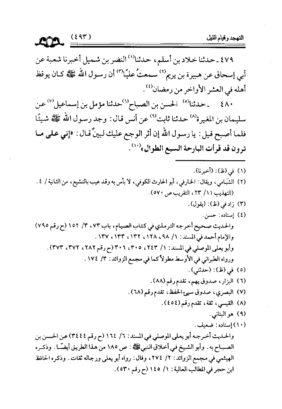479 - حدثنا خلاد بن أسلم حدثنا النضر بن شميل أخبرنا شعبة عن أبي إسحاق عن هبيرة بن يريم سمعت عليا أن رسول الله كان يوقظ أهل في العشر الأواخر من رمضان // إسناده حسن //