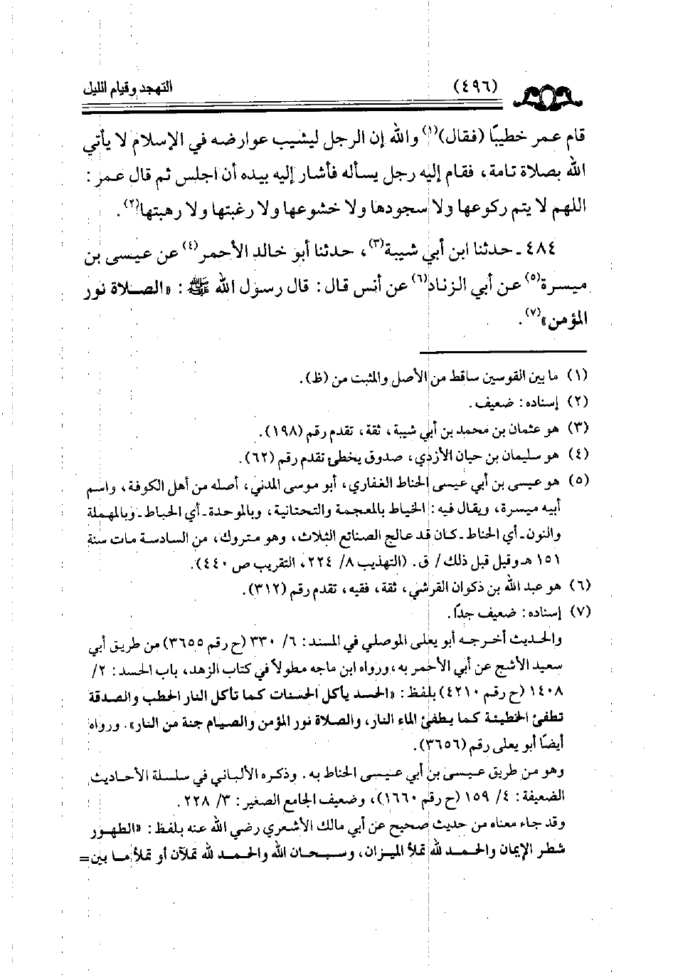 484 - حدثنا ابن أبي شيبة حدثنا أبو خالد الأحمر عن عيسى بن ميسرة عن أبي الزناد عن أنس قال قال رسول الله ( الصلاة نور المؤمن ) // إسناده ضعيف جدا //