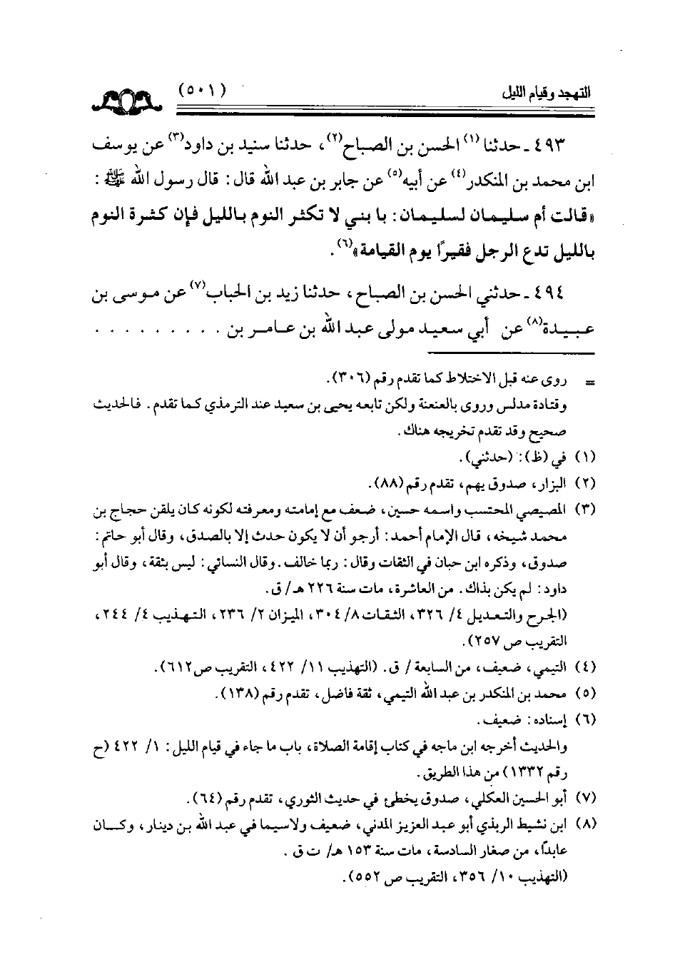 493 - حدثنا الحسن بن الصباح حدثنا سنيد بن داود عن يوسف ابن محمد بن المنكدر عن أبيه عن جابر بن عبد الله قال قال رسول الله ( قالت أم سليمان لسليمان يا بني لا تكثر النوم بالليل فإن كثرة النوم بالليل تدع الرجل فقيرا يوم القيامة ) // إسناده ضعيف //