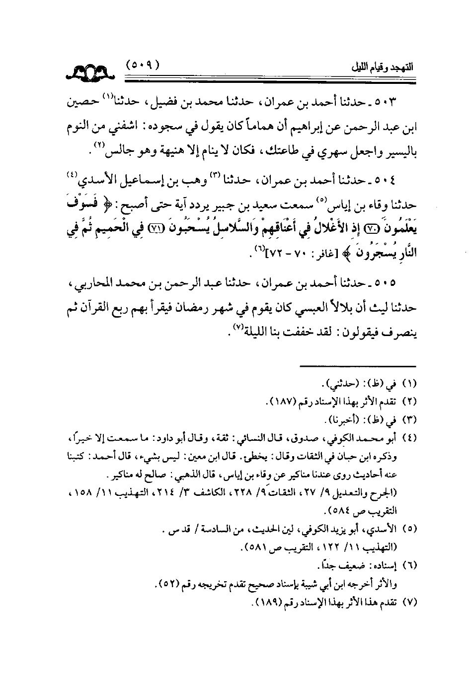 505 - حدثنا أحمد بن عمران حدثنا عبد الرحمن بن محمد المحاربي حدثنا ليث أن بلالا العبسي كان يقوم في شهر رمضان فيقرأ بهم ربع القرآن ثم ينصرف فيقولون لقد خففت بنا الليلة // تقدم هذا الأثر بهذا الإسناد رقم 189 //