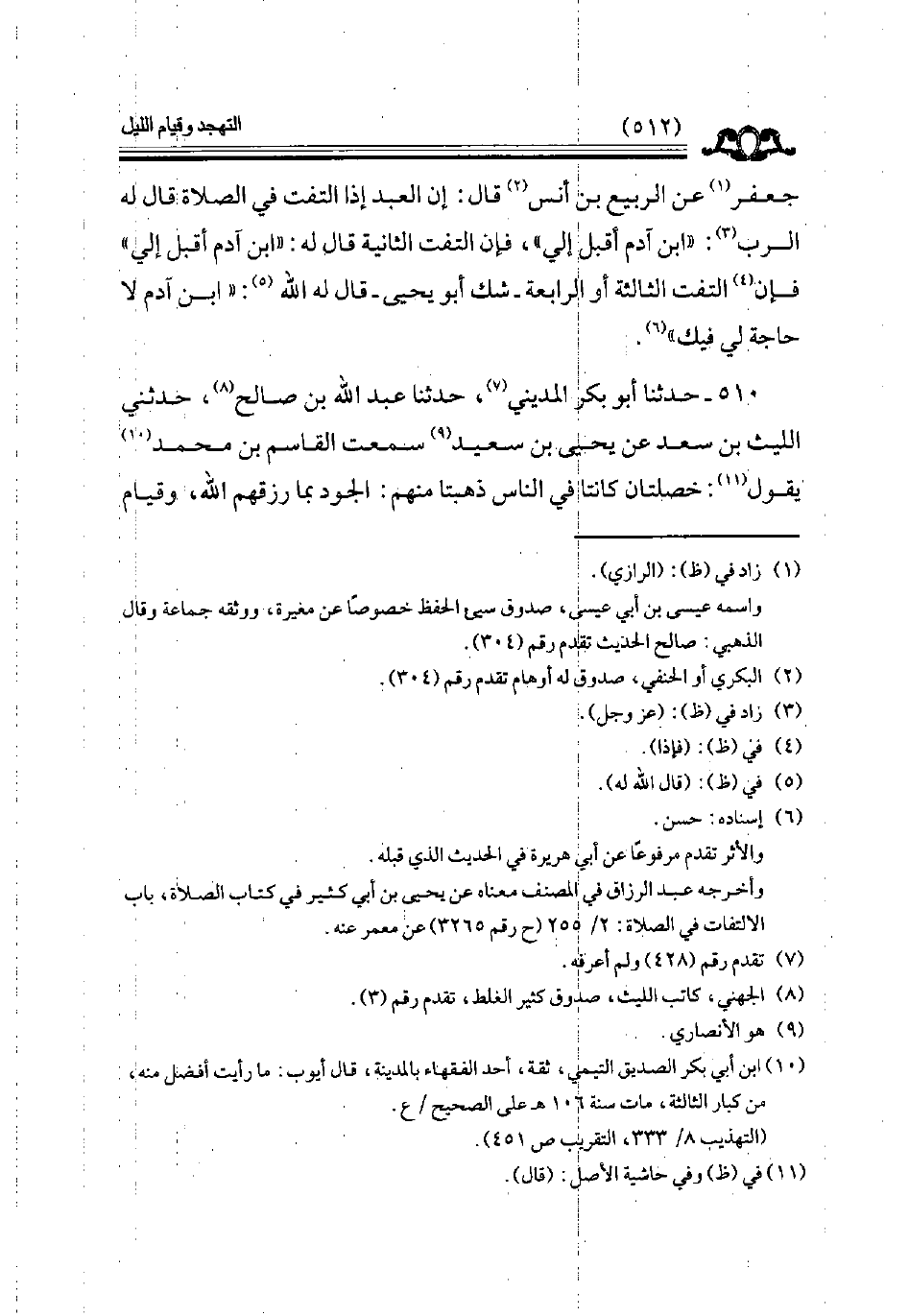 510 - حدثنا أبو بكر المديني حدثنا عبد الله بن صالح حدثني الليث بن سعد عن يحيى بن سعيد سمعت القاسم بن محمد يقول خصلتان كانتا في الناس ذهبتا منهم الجود بما رزقهم الله وقيام