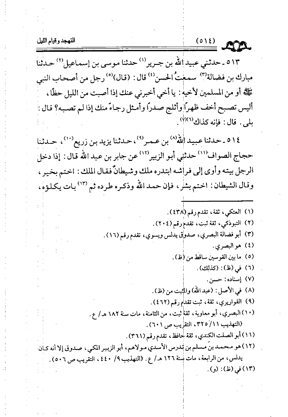 513 - حدثني عبيد الله بن جرير حدثنا موسى بن إسماعيل حدثنا مبارك بن فضالة سمعت الحسن قال قال رجل من أصحاب النبي أو من المسلمين لأخيه يا أخي أخبرني عنك إذا أصبت من الليل حظا أليس تصبح أخف ظهرا وأثلج صدرا وامثل رجاء منك إذا لم تصبه قال بلى قال فإنه كذاك // إسناده حسن //