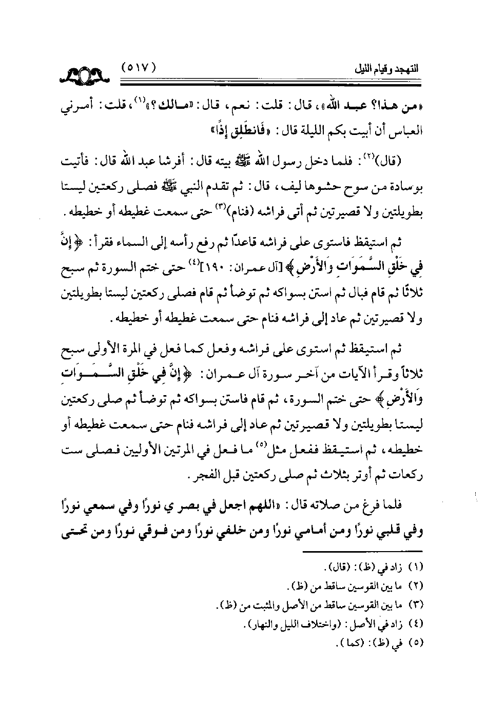 فلما فرغ من صلاته قال ( اللهم اجعل في بصري نورا وفي سمعي نورا وفي قلبي نورا ومن أمامي نورا ومن خلفي نورا ومن فوقي نورا ومن تحتي