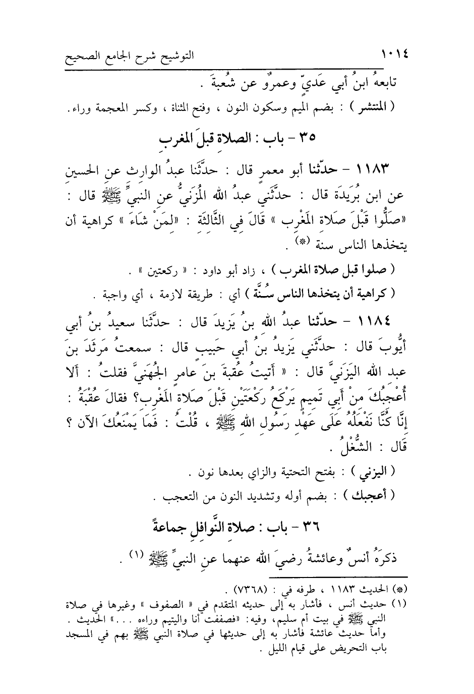 1184 - حَدَّثَنَا عَبْدُ اللَّهِ بْنُ يَزِيدَ هُوَ المُقْرِئُ، قَالَ: حَدَّثَنَا سَعِيدُ بْنُ أَبِي أَيُّوبَ، قَالَ: حَدَّثَنِي يَزِيدُ بْنُ أَبِي حَبِيبٍ، قَالَ: سَمِعْتُ مَرْثَدَ بْنَ عَبْدِ اللَّهِ اليَزَنِيَّ، قَالَ: أَتَيْتُ عُقْبَةَ بْنَ عَامِرٍ الجُهَنِيَّ، فَقُلْتُ: أَلاَ أُعْجِبُكَ مِنْ أَبِي تَمِيمٍ يَرْكَعُ رَكْعَتَيْنِ قَبْلَ صَلاَةِ المَغْرِبِ؟ فَقَالَ عُقْبَةُ: «إِنَّا كُنَّا نَفْعَلُهُ عَلَى عَهْدِ رَسُولِ اللَّهِ صَلَّى اللهُ عَلَيْهِ وَسَلَّمَ»، قُلْتُ: فَمَا يَمْنَعُكَ الآنَ؟ قَالَ: «الشُّغْلُ».