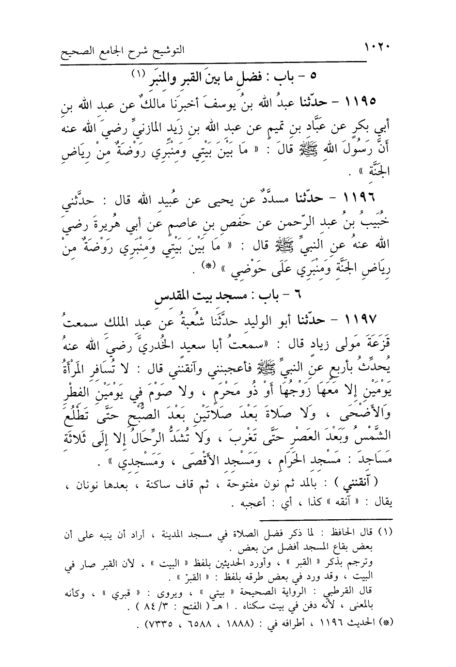 1195 - حَدَّثَنَا عَبْدُ اللَّهِ بْنُ يُوسُفَ، أَخْبَرَنَا مَالِكٌ، عَنْ عَبْدِ اللَّهِ بْنِ أَبِي بَكْرٍ، عَنْ عَبَّادِ بْنِ تَمِيمٍ، عَنْ عَبْدِ اللَّهِ بْنِ زَيْدٍ المَازِنِيِّ رَضِيَ اللَّهُ عَنْهُ: أَنَّ رَسُولَ اللَّهِ صَلَّى اللهُ عَلَيْهِ وَسَلَّمَ قَالَ: «مَا بَيْنَ بَيْتِي وَمِنْبَرِي رَوْضَةٌ مِنْ رِيَاضِ الجَنَّةِ».