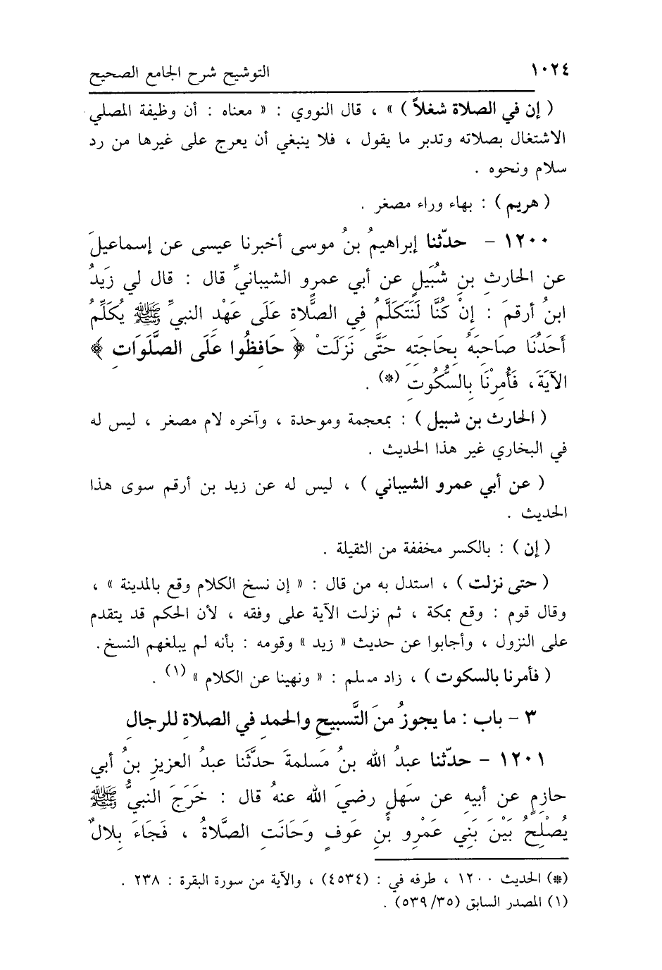 1200 - حَدَّثَنَا إِبْرَاهِيمُ بْنُ مُوسَى، أَخْبَرَنَا عِيسَى هُوَ ابْنُ يُونُسَ عَنْ إِسْمَاعِيلَ، عَنِ الحَارِثِ بْنِ شُبَيْلٍ، عَنْ أَبِي عَمْرٍو الشَّيْبَانِيِّ، قَالَ: قَالَ لِي زَيْدُ بْنُ أَرْقَمَ: إِنْ كُنَّا لَنَتَكَلَّمُ فِي الصَّلاَةِ عَلَى عَهْدِ النَّبِيِّ صَلَّى اللهُ عَلَيْهِ وَسَلَّمَ يُكَلِّمُ أَحَدُنَا صَاحِبَهُ بِحَاجَتِهِ، حَتَّى نَزَلَتْ: {حَافِظُوا عَلَى الصَّلَوَاتِ، وَالصَّلاَةِ الوُسْطَى، وَقُومُوا لِلَّهِ قَانِتِينَ} [البقرة: 238] «فَأُمِرْنَا بِالسُّكُوتِ».