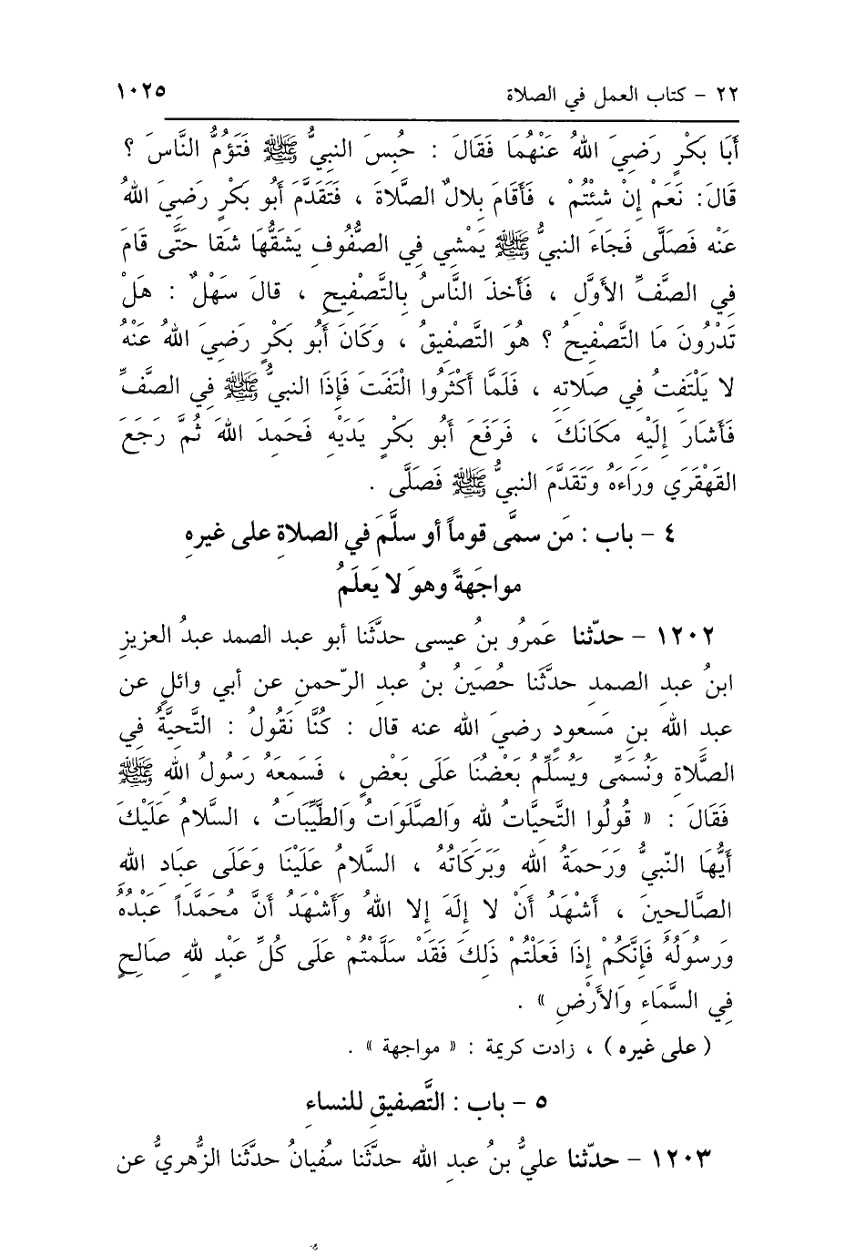 1202 - حَدَّثَنَا عَمْرُو بْنُ عِيسَى، حَدَّثَنَا أَبُو عَبْدِ الصَّمَدِ عَبْدُ العَزِيزِ بْنُ عَبْدِ الصَّمَدِ، حَدَّثَنَا حُصَيْنُ بْنُ عَبْدِ الرَّحْمَنِ، عَنْ أَبِي وَائِلٍ، عَنْ عَبْدِ اللَّهِ بْنِ مَسْعُودٍ رَضِيَ اللَّهُ عَنْهُ، قَالَ: كُنَّا نَقُولُ: التَّحِيَّةُ فِي الصَّلاَةِ، وَنُسَمِّي، وَيُسَلِّمُ بَعْضُنَا عَلَى بَعْضٍ، فَسَمِعَهُ رَسُولُ اللَّهِ صَلَّى اللهُ عَلَيْهِ وَسَلَّمَ، فَقَالَ: " قُولُوا: التَّحِيَّاتُ لِلَّهِ وَالصَّلَوَاتُ وَالطَّيِّبَاتُ، السَّلاَمُ عَلَيْكَ أَيُّهَا النَّبِيُّ وَرَحْمَةُ اللَّهِ وَبَرَكَاتُهُ، السَّلاَمُ عَلَيْنَا وَعَلَى عِبَادِ اللَّهِ الصَّالِحِينَ، أَشْهَدُ أَنْ لاَ إِلَهَ إِلَّا اللَّهُ وَأَشْهَدُ أَنَّ مُحَمَّدًا عَبْدُهُ وَرَسُولُهُ، فَإِنَّكُمْ إِذَا فَعَلْتُمْ ذَلِكَ فَقَدْ سَلَّمْتُمْ عَلَى كُلِّ عَبْدٍ لِلَّهِ صَالِحٍ فِي السَّمَاءِ وَالأَرْضِ".