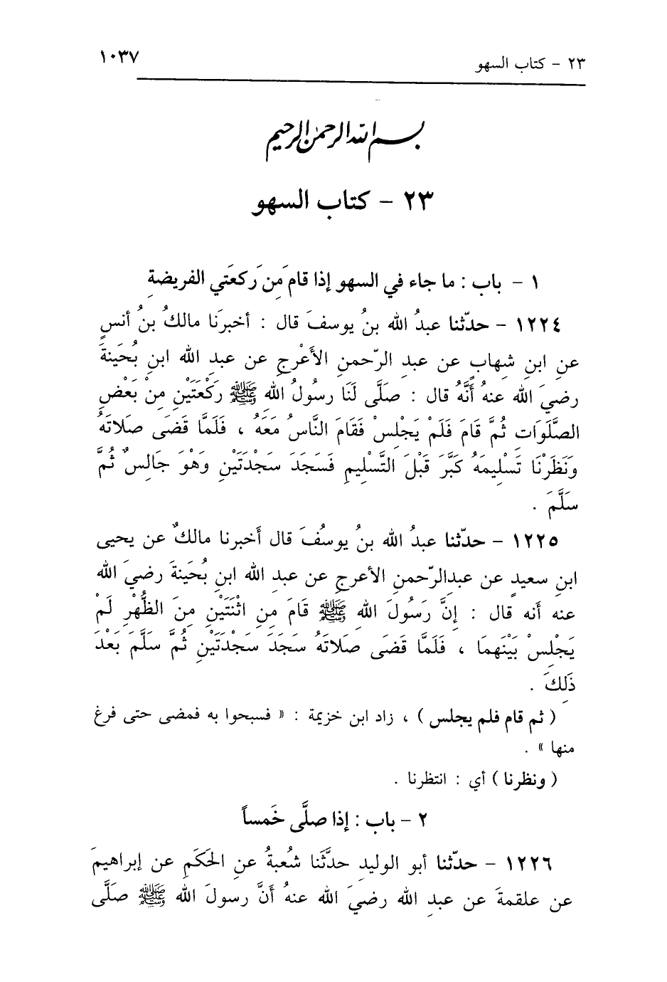 1225 - حَدَّثَنَا عَبْدُ اللَّهِ بْنُ يُوسُفَ، أَخْبَرَنَا مَالِكٌ، عَنْ يَحْيَى بْنِ سَعِيدٍ، عَنْ عَبْدِ الرَّحْمَنِ الأَعْرَجِ، عَنْ عَبْدِ اللَّهِ ابْنِ بُحَيْنَةَ رَضِيَ اللَّهُ عَنْهُ، أَنَّهُ قَالَ: «إِنَّ رَسُولَ اللَّهِ صَلَّى اللهُ عَلَيْهِ وَسَلَّمَ قَامَ مِنَ اثْنَتَيْنِ مِنَ الظُّهْرِ لَمْ يَجْلِسْ بَيْنَهُمَا، فَلَمَّا قَضَى صَلاَتَهُ سَجَدَ سَجْدَتَيْنِ، ثُمَّ سَلَّمَ بَعْدَ ذَلِكَ».