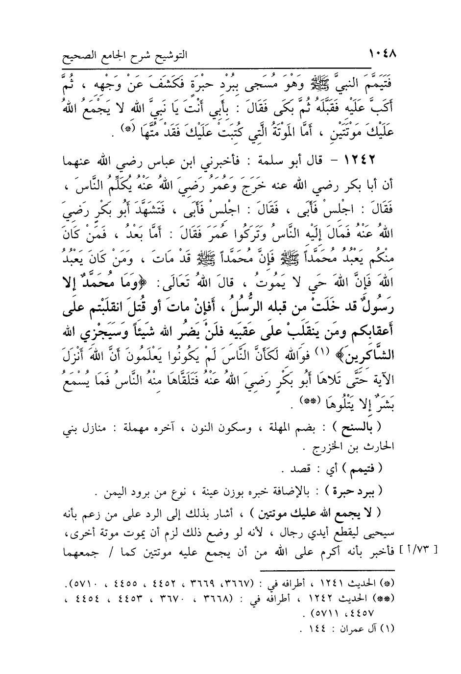 1242 - قَالَ أَبُو سَلَمَةَ: فَأَخْبَرَنِي ابْنُ عَبَّاسٍ رَضِيَ اللَّهُ عَنْهُمَا: أَنَّ أَبَا بَكْرٍ رَضِيَ اللَّهُ عَنْهُ خَرَجَ، وَعُمَرُ رَضِيَ اللَّهُ عَنْهُ يُكَلِّمُ النَّاسَ، فَقَالَ: «اجْلِسْ»، فَأَبَى، فَقَالَ: «اجْلِسْ»، فَأَبَى، فَتَشَهَّدَ أَبُو بَكْرٍ رَضِيَ اللَّهُ عَنْهُ، فَمَالَ إِلَيْهِ النَّاسُ، وَتَرَكُوا عُمَرَ، فَقَالَ: " أَمَّا بَعْدُ، فَمَنْ كَانَ مِنْكُمْ يَعْبُدُ مُحَمَّدًا صَلَّى اللهُ عَلَيْهِ وَسَلَّمَ، فَإِنَّ مُحَمَّدًا صَلَّى اللهُ عَلَيْهِ وَسَلَّمَ قَدْ مَاتَ، وَمَنْ كَانَ يَعْبُدُ اللَّهَ، فَإِنَّ اللَّهَ حَيٌّ لَا يَمُوتُ، قَالَ اللَّهُ تَعَالَى: {وَمَا مُحَمَّدٌ إِلَّا رَسُولٌ قَدْ خَلَتْ مِنْ قَبْلِهِ الرُّسُلُ} [آل عمران: 144] إِلَى {الشَّاكِرِينَ} [آل عمران: 144] " وَاللَّهِ لَكَأَنَّ النَّاسَ لَمْ يَكُونُوا يَعْلَمُونَ أَنَّ اللَّهَ أَنْزَلَهَا حَتَّى تَلَاهَا أَبُو بَكْرٍ رَضِيَ اللَّهُ عَنْهُ، فَتَلَقَّاهَا مِنْهُ النَّاسُ، فَمَا يُسْمَعُ بَشَرٌ إِلَّا يَتْلُوهَا.