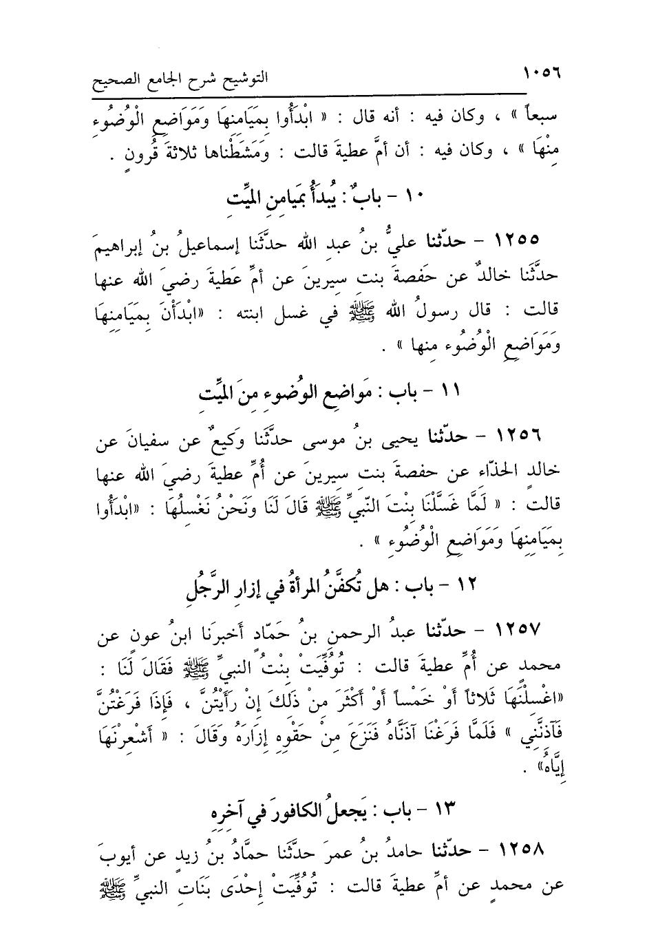 1258 - حَدَّثَنَا حَامِدُ بْنُ عُمَرَ، حَدَّثَنَا حَمَّادُ بْنُ زَيْدٍ، عَنْ أَيُّوبَ، عَنْ مُحَمَّدٍ، عَنْ أُمِّ عَطِيَّةَ، قَالَتْ: تُوُفِّيَتْ إِحْدَى بَنَاتِ النَّبِيِّ صَلَّى اللهُ عَلَيْهِ وَسَلَّمَ،