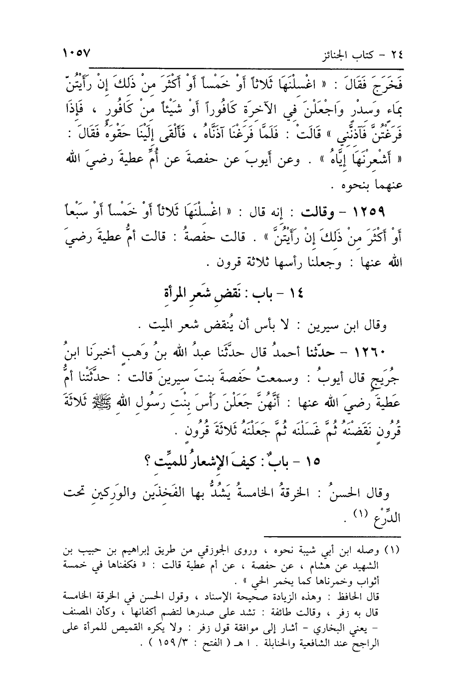 1259 - وَقَالَتْ: إِنَّهُ قَالَ: «اغْسِلْنَهَا ثَلاَثًا، أَوْ خَمْسًا أَوْ سَبْعًا، أَوْ أَكْثَرَ مِنْ ذَلِكَ، إِنْ رَأَيْتُنَّ» قَالَتْ حَفْصَةُ: قَالَتْ أُمُّ عَطِيَّةَ رَضِيَ اللَّهُ عَنْهَا: وَجَعَلْنَا رَأْسَهَا ثَلاَثَةَ قُرُونٍ.