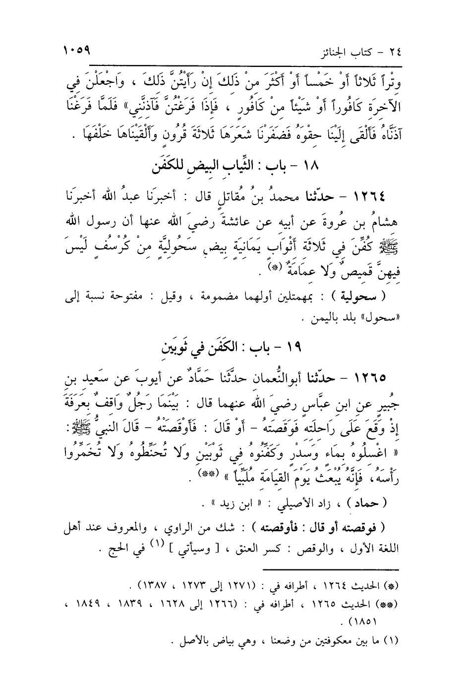 1265 - حَدَّثَنَا أَبُو النُّعْمَانِ، حَدَّثَنَا حَمَّادُ بْنُ زَيْدٍ، عَنْ أَيُّوبَ، عَنْ سَعِيدِ بْنِ جُبَيْرٍ، عَنِ ابْنِ عَبَّاسٍ رَضِيَ اللَّهُ عَنْهُمْ، قَالَ: بَيْنَمَا رَجُلٌ وَاقِفٌ بِعَرَفَةَ، إِذْ وَقَعَ عَنْ رَاحِلَتِهِ، فَوَقَصَتْهُ - أَوْ قَالَ: فَأَوْقَصَتْهُ - قَالَ النَّبِيُّ صَلَّى اللهُ عَلَيْهِ وَسَلَّمَ: «اغْسِلُوهُ بِمَاءٍ وَسِدْرٍ، وَكَفِّنُوهُ فِي ثَوْبَيْنِ، وَلاَ تُحَنِّطُوهُ، وَلاَ تُخَمِّرُوا رَأْسَهُ، فَإِنَّهُ يُبْعَثُ يَوْمَ القِيَامَةِ مُلَبِّيًا».