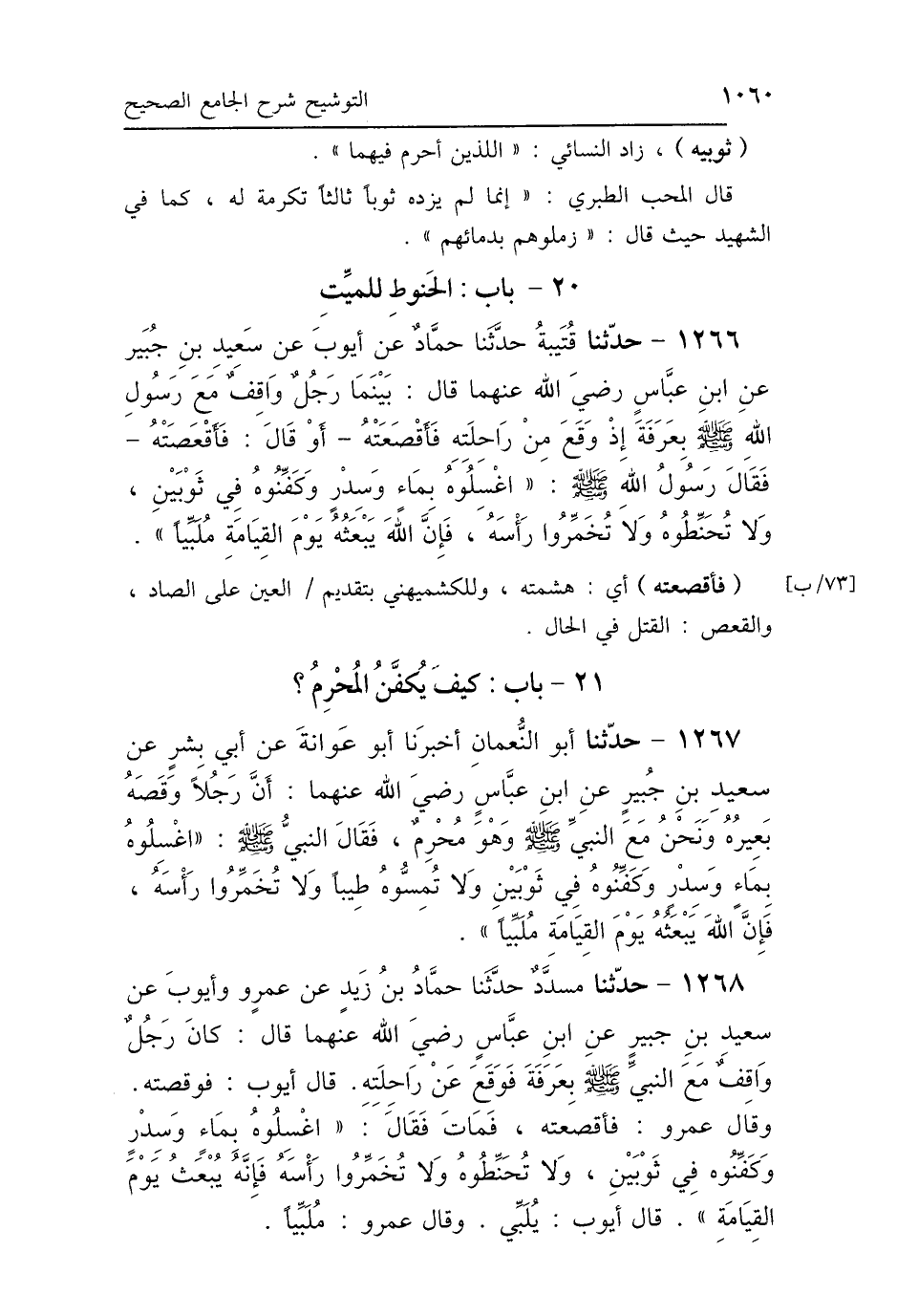 1266 - حَدَّثَنَا قُتَيْبَةُ، حَدَّثَنَا حَمَّادٌ، عَنْ أَيُّوبَ، عَنْ سَعِيدِ بْنِ جُبَيْرٍ، عَنِ ابْنِ عَبَّاسٍ رَضِيَ اللَّهُ عَنْهُمَا، قَالَ: بَيْنَمَا رَجُلٌ وَاقِفٌ مَعَ رَسُولِ اللَّهِ صَلَّى اللهُ عَلَيْهِ وَسَلَّمَ بِعَرَفَةَ، إِذْ وَقَعَ مِنْ رَاحِلَتِهِ، فَأَقْصَعَتْهُ - أَوْ قَالَ: فَأَقْعَصَتْهُ - فَقَالَ رَسُولُ اللَّهِ صَلَّى اللهُ عَلَيْهِ وَسَلَّمَ: «اغْسِلُوهُ بِمَاءٍ وَسِدْرٍ، وَكَفِّنُوهُ فِي ثَوْبَيْنِ، وَلاَ تُحَنِّطُوهُ، وَلاَ تُخَمِّرُوا رَأْسَهُ، فَإِنَّ اللَّهَ يَبْعَثُهُ يَوْمَ القِيَامَةِ مُلَبِّيًا».