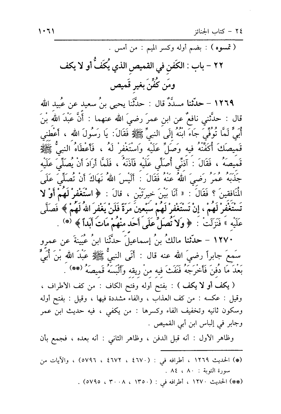 1269 - حَدَّثَنَا مُسَدَّدٌ، قَالَ: حَدَّثَنَا يَحْيَى بْنُ سَعِيدٍ، عَنْ عُبَيْدِ اللَّهِ، قَالَ: حَدَّثَنِي نَافِعٌ، عَنِ ابْنِ عُمَرَ رَضِيَ اللَّهُ عَنْهُمَا: أَنَّ عَبْدَ اللَّهِ بْنَ أُبَيٍّ لَمَّا تُوُفِّيَ، جَاءَ ابْنُهُ إِلَى النَّبِيِّ صَلَّى اللهُ عَلَيْهِ وَسَلَّمَ، فَقَالَ: يَا رَسُولَ اللَّهِ، أَعْطِنِي قَمِيصَكَ أُكَفِّنْهُ فِيهِ، وَصَلِّ عَلَيْهِ، وَاسْتَغْفِرْ لَهُ، فَأَعْطَاهُ النَّبِيُّ صَلَّى اللهُ عَلَيْهِ وَسَلَّمَ قَمِيصَهُ، فَقَالَ: «آذِنِّي أُصَلِّي عَلَيْهِ»، فَآذَنَهُ، فَلَمَّا أَرَادَ أَنْ يُصَلِّيَ عَلَيْهِ جَذَبَهُ عُمَرُ رَضِيَ اللَّهُ عَنْهُ، فَقَالَ: أَلَيْسَ اللَّهُ نَهَاكَ أَنْ تُصَلِّيَ عَلَى المُنَافِقِينَ؟ فَقَالَ: " أَنَا بَيْنَ خِيَرَتَيْنِ، قَالَ: {اسْتَغْفِرْ لَهُمْ أَوْ لاَ تَسْتَغْفِرْ لَهُمْ إِنْ تَسْتَغْفِرْ لَهُمْ سَبْعِينَ مَرَّةً، فَلَنْ يَغْفِرَ اللَّهُ لَهُمْ} [التوبة: 80] " فَصَلَّى عَلَيْهِ، فَنَزَلَتْ: {وَلاَ تُصَلِّ عَلَى أَحَدٍ مِنْهُمْ مَاتَ أَبَدًا، وَلاَ تَقُمْ عَلَى قَبْرِهِ} [التوبة: 84].
