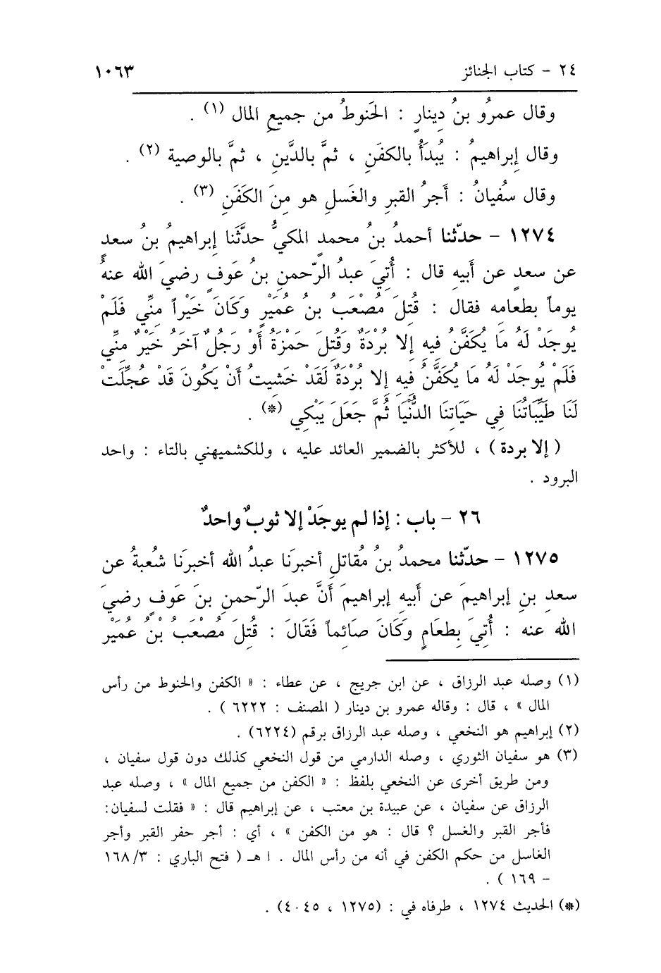 1274 - حَدَّثَنَا أَحْمَدُ بْنُ مُحَمَّدٍ المَكِّيُّ، حَدَّثَنَا إِبْرَاهِيمُ بْنُ سَعْدٍ، عَنْ سَعْدٍ، عَنْ أَبِيهِ، قَالَ: أُتِيَ عَبْدُ الرَّحْمَنِ بْنُ عَوْفٍ رَضِيَ اللَّهُ عَنْهُ يَوْمًا بِطَعَامِهِ، فَقَالَ: «قُتِلَ مُصْعَبُ بْنُ عُمَيْرٍ وَكَانَ خَيْرًا مِنِّي، فَلَمْ يُوجَدْ لَهُ مَا يُكَفَّنُ فِيهِ إِلَّا بُرْدَةٌ، وَقُتِلَ حَمْزَةُ - أَوْ رَجُلٌ آخَرُ - خَيْرٌ مِنِّي، فَلَمْ يُوجَدْ لَهُ مَا يُكَفَّنُ فِيهِ إِلَّا بُرْدَةٌ، لَقَدْ خَشِيتُ أَنْ يَكُونَ قَدْ عُجِّلَتْ لَنَا طَيِّبَاتُنَا فِي حَيَاتِنَا الدُّنْيَا ثُمَّ جَعَلَ يَبْكِي».