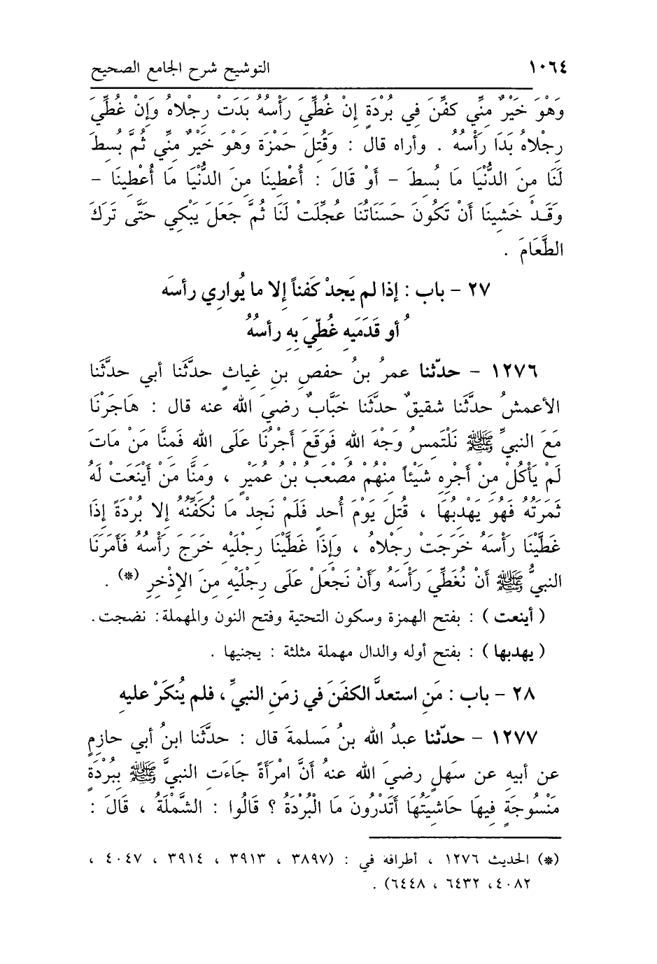 1276 - حَدَّثَنَا عُمَرُ بْنُ حَفْصِ بْنِ غِيَاثٍ، حَدَّثَنَا أَبِي، حَدَّثَنَا الأَعْمَشُ، حَدَّثَنَا شَقِيقٌ، حَدَّثَنَا خَبَّابٌ رَضِيَ اللَّهُ عَنْهُ، قَالَ: هَاجَرْنَا مَعَ النَّبِيِّ صَلَّى اللهُ عَلَيْهِ وَسَلَّمَ نَلْتَمِسُ وَجْهَ اللَّهِ، فَوَقَعَ أَجْرُنَا عَلَى اللَّهِ، فَمِنَّا مَنْ مَاتَ لَمْ يَأْكُلْ مِنْ أَجْرِهِ شَيْئًا، مِنْهُمْ مُصْعَبُ بْنُ عُمَيْرٍ وَمِنَّا مَنْ أَيْنَعَتْ لَهُ ثَمَرَتُهُ، فَهُوَ يَهْدِبُهَا، قُتِلَ يَوْمَ أُحُدٍ، فَلَمْ نَجِدْ مَا نُكَفِّنُهُ إِلَّا بُرْدَةً إِذَا غَطَّيْنَا بِهَا رَأْسَهُ خَرَجَتْ رِجْلاَهُ، وَإِذَا غَطَّيْنَا رِجْلَيْهِ خَرَجَ رَأْسُهُ، «فَأَمَرَنَا النَّبِيُّ صَلَّى اللهُ عَلَيْهِ وَسَلَّمَ أَنْ نُغَطِّيَ رَأْسَهُ، وَأَنْ نَجْعَلَ عَلَى رِجْلَيْهِ مِنَ الإِذْخِرِ».
