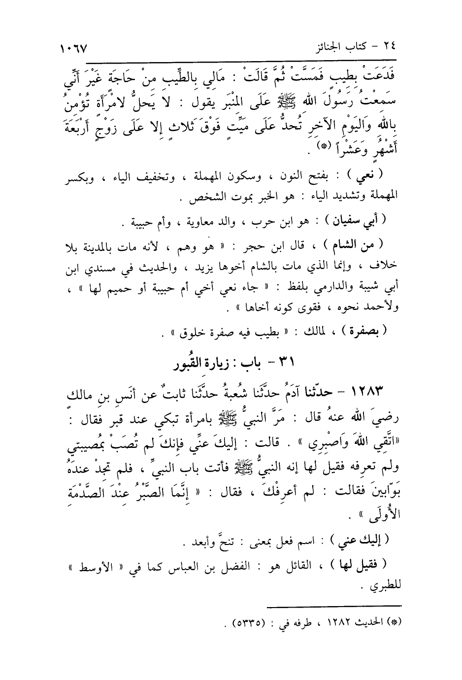 1283 - حَدَّثَنَا آدَمُ، حَدَّثَنَا شُعْبَةُ، حَدَّثَنَا ثَابِتٌ، عَنْ أَنَسِ بْنِ مَالِكٍ رَضِيَ اللَّهُ عَنْهُ، قَالَ: مَرَّ النَّبِيُّ صَلَّى اللهُ عَلَيْهِ وَسَلَّمَ بِامْرَأَةٍ تَبْكِي عِنْدَ قَبْرٍ، فَقَالَ: «اتَّقِي اللَّهَ وَاصْبِرِي» قَالَتْ: إِلَيْكَ عَنِّي، فَإِنَّكَ لَمْ تُصَبْ بِمُصِيبَتِي، وَلَمْ تَعْرِفْهُ، فَقِيلَ لَهَا: إِنَّهُ النَّبِيُّ صَلَّى اللهُ عَلَيْهِ وَسَلَّمَ، فَأَتَتْ بَابَ النَّبِيِّ صَلَّى اللهُ عَلَيْهِ وَسَلَّمَ، فَلَمْ تَجِدْ عِنْدَهُ بَوَّابِينَ، فَقَالَتْ: لَمْ أَعْرِفْكَ، فَقَالَ: «إِنَّمَا الصَّبْرُ عِنْدَ الصَّدْمَةِ الأُولَى».