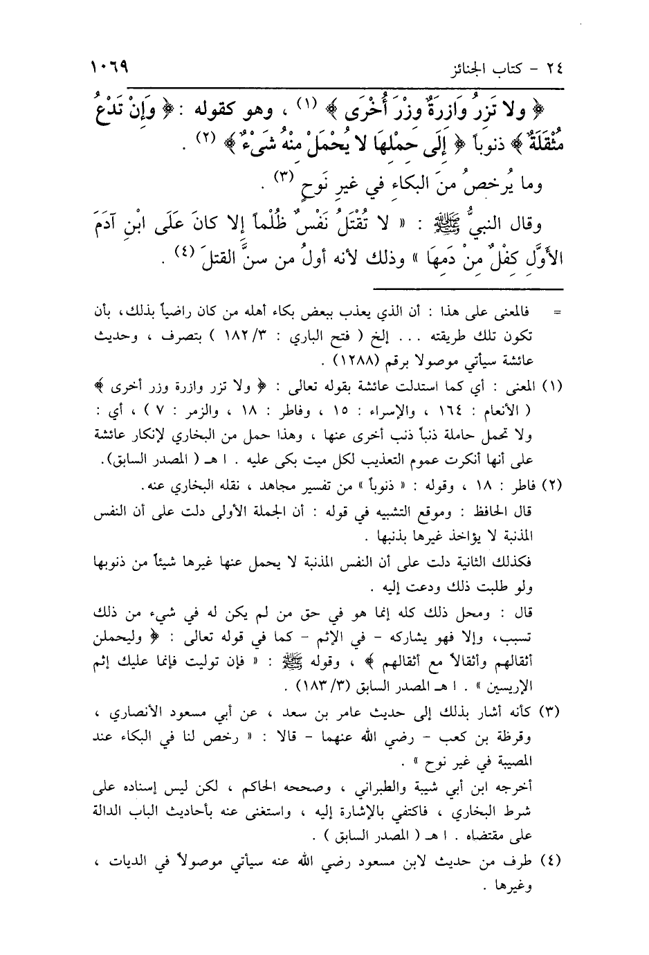 {لاَ تَزِرُ وَازِرَةٌ وِزْرَ أُخْرَى} [الأنعام: 164] " وَهُوَ كَقَوْلِهِ: {وَإِنْ تَدْعُ مُثْقَلَةٌ} [فاطر: 18] ذُنُوبًا {إِلَى حِمْلِهَا لاَ يُحْمَلْ مِنْهُ شَيْءٌ} [فاطر: 18].