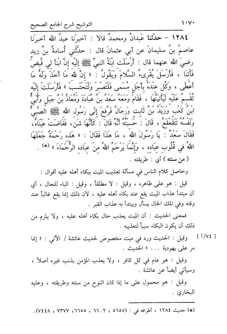 1284 - حَدَّثَنَا عَبْدَانُ، وَمُحَمَّدٌ، قَالاَ: أَخْبَرَنَا عَبْدُ اللَّهِ، أَخْبَرَنَا عَاصِمُ بْنُ سُلَيْمَانَ، عَنْ أَبِي عُثْمَانَ، قَالَ: حَدَّثَنِي أُسَامَةُ بْنُ زَيْدٍ رَضِيَ اللَّهُ عَنْهُمَا، قَالَ: أَرْسَلَتِ ابْنَةُ النَّبِيِّ صَلَّى اللهُ عَلَيْهِ وَسَلَّمَ إِلَيْهِ إِنَّ ابْنًا لِي قُبِضَ، فَأْتِنَا، فَأَرْسَلَ يُقْرِئُ السَّلاَمَ، وَيَقُولُ: «إِنَّ لِلَّهِ مَا أَخَذَ، وَلَهُ مَا أَعْطَى، وَكُلٌّ عِنْدَهُ بِأَجَلٍ مُسَمًّى، فَلْتَصْبِرْ، وَلْتَحْتَسِبْ»، فَأَرْسَلَتْ إِلَيْهِ تُقْسِمُ عَلَيْهِ لَيَأْتِيَنَّهَا، فَقَامَ وَمَعَهُ سَعْدُ بْنُ عُبَادَةَ، وَمَعَاذُ بْنُ جَبَلٍ، وَأُبَيُّ بْنُ كَعْبٍ، وَزَيْدُ بْنُ ثَابِتٍ وَرِجَالٌ، فَرُفِعَ إِلَى رَسُولِ اللَّهِ صَلَّى اللهُ عَلَيْهِ وَسَلَّمَ الصَّبِيُّ وَنَفْسُهُ تَتَقَعْقَعُ - قَالَ: حَسِبْتُهُ أَنَّهُ قَالَ كَأَنَّهَا شَنٌّ - فَفَاضَتْ عَيْنَاهُ، فَقَالَ سَعْدٌ: يَا رَسُولَ اللَّهِ، مَا هَذَا؟ فَقَالَ: «هَذِهِ رَحْمَةٌ جَعَلَهَا اللَّهُ فِي قُلُوبِ عِبَادِهِ، وَإِنَّمَا يَرْحَمُ اللَّهُ مِنْ عِبَادِهِ الرُّحَمَاءَ».