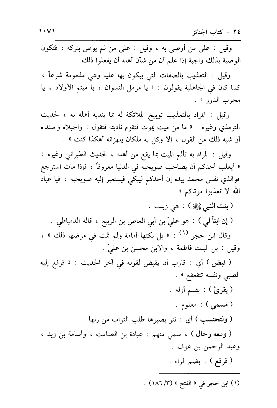 وقال ابن حجر: "بل بكتها أمامة ولم تمت في مرضها ذلك"، وقيل: بل البنت فاطمة، والابن محسن بن عليّ.