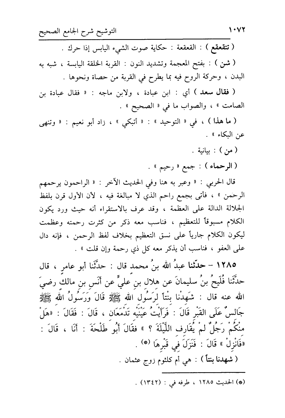 قال الحربي: "وعبر به هنا وفي الحديث الآخر: "الراحمون يرحمهم الرحمن"، فأتى بجمع راحم الذي لا مبالغة فيه، لأن الأول قرن بلفظ الجلالة الدالة على العظمة، وقد عرف بالاستقراء أنه حيث ورد يكون الكلام مسبوقًا للتعظيم، فناسب معه ذكر من كثرت رحمته وعظمت ليكون الكلام جاريًا على نسق التعظيم بخلاف لفظ الرحمن، فإنه دال على العفو، فناسب أن يذكر معه كل ذي رحمة وإن قلت".