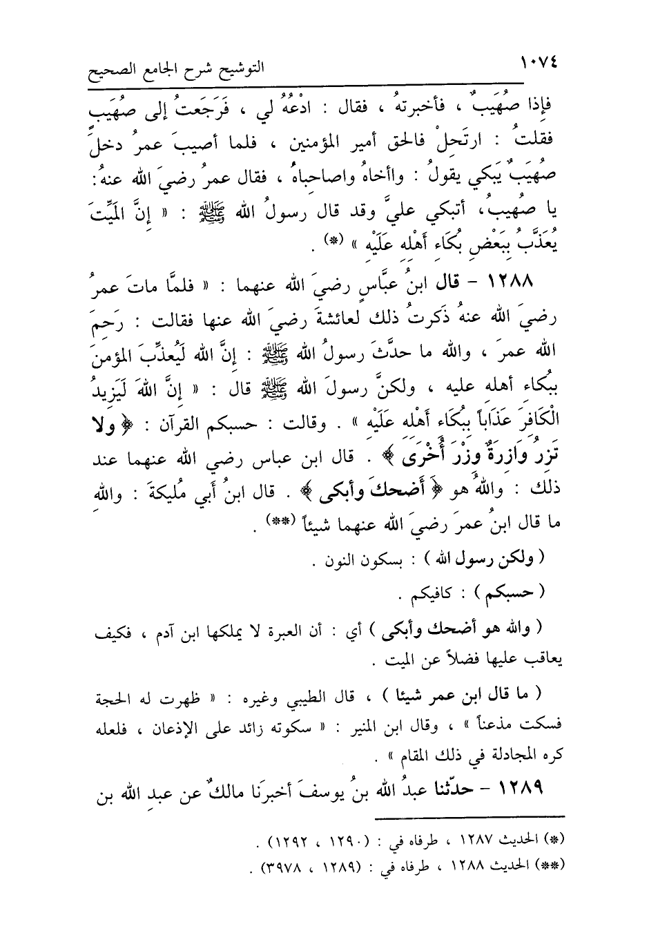 1288 - قَالَ ابْنُ عَبَّاسٍ رَضِيَ اللَّهُ عَنْهُمَا: فَلَمَّا مَاتَ عُمَرُ رَضِيَ اللَّهُ عَنْهُ، ذَكَرْتُ ذَلِكَ لِعَائِشَةَ رَضِيَ اللَّهُ عَنْهَا، فَقَالَتْ: رَحِمَ اللَّهُ عُمَرَ، وَاللَّهِ مَا حَدَّثَ رَسُولُ اللَّهِ صَلَّى اللهُ عَلَيْهِ وَسَلَّمَ: «إِنَّ اللَّهَ لَيُعَذِّبُ المُؤْمِنَ بِبُكَاءِ أَهْلِهِ عَلَيْهِ»، وَلَكِنَّ رَسُولَ اللَّهِ صَلَّى اللهُ عَلَيْهِ وَسَلَّمَ قَالَ: «إِنَّ اللَّهَ لَيَزِيدُ الكَافِرَ عَذَابًا بِبُكَاءِ أَهْلِهِ عَلَيْهِ»، وَقَالَتْ: حَسْبُكُمُ القُرْآنُ: {وَلاَ تَزِرُ وَازِرَةٌ وِزْرَ أُخْرَى} [الأنعام: 164] قَالَ ابْنُ عَبَّاسٍ رَضِيَ اللَّهُ عَنْهُمَا: «عِنْدَ ذَلِكَ وَاللَّهُ هُوَ أَضْحَكَ وَأَبْكَى» قَالَ ابْنُ أَبِي مُلَيْكَةَ: «وَاللَّهِ مَا قَالَ ابْنُ عُمَرَ رَضِيَ اللَّهُ عَنْهُمَا شَيْئًا».