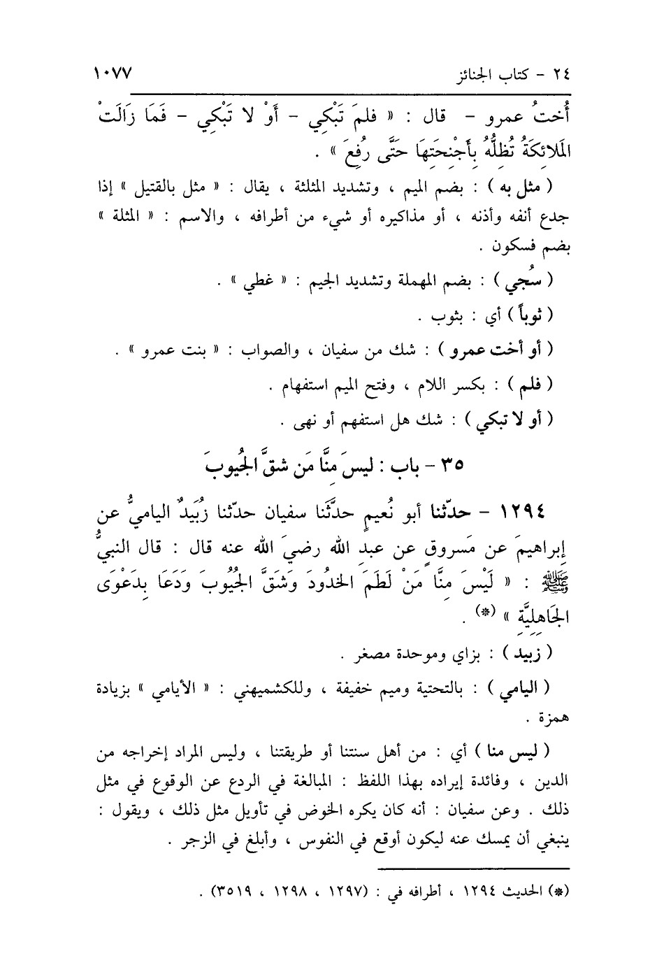 1294 - حَدَّثَنَا أَبُو نُعَيْمٍ، حَدَّثَنَا سُفْيَانُ، حَدَّثَنَا زُبَيْدٌ اليَامِيُّ، عَنْ إِبْرَاهِيمَ، عَنْ مَسْرُوقٍ، عَنْ عَبْدِ اللَّهِ رَضِيَ اللَّهُ عَنْهُ، قَالَ: قَالَ النَّبِيُّ صَلَّى اللهُ عَلَيْهِ وَسَلَّمَ: «لَيْسَ مِنَّا مَنْ لَطَمَ الخُدُودَ، وَشَقَّ الجُيُوبَ، وَدَعَا بِدَعْوَى الجَاهِلِيَّةِ».
