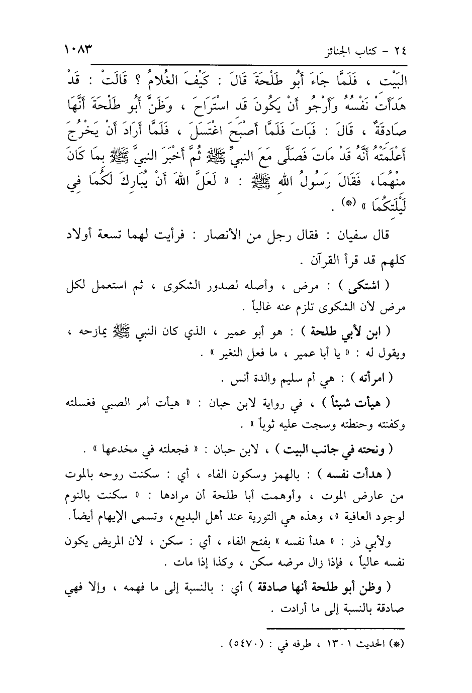 البَيْتِ، فَلَمَّا جَاءَ أَبُو طَلْحَةَ قَالَ: كَيْفَ الغُلاَمُ، قَالَتْ: قَدْ هَدَأَتْ نَفْسُهُ، وَأَرْجُو أَنْ يَكُونَ قَدِ اسْتَرَاحَ، وَظَنَّ أَبُو طَلْحَةَ أَنَّهَا صَادِقَةٌ، قَالَ: فَبَاتَ، فَلَمَّا أَصْبَحَ اغْتَسَلَ، فَلَمَّا أَرَادَ أَنْ يَخْرُجَ أَعْلَمَتْهُ أَنَّهُ قَدْ مَاتَ، فَصَلَّى مَعَ النَّبِيِّ صَلَّى اللهُ عَلَيْهِ وَسَلَّمَ، ثُمَّ أَخْبَرَ النَّبِيَّ صَلَّى اللهُ عَلَيْهِ وَسَلَّمَ بِمَا كَانَ مِنْهُمَا، فَقَالَ رَسُولُ اللَّهِ صَلَّى اللهُ عَلَيْهِ وَسَلَّمَ: «لَعَلَّ اللَّهَ أَنْ يُبَارِكَ لَكُمَا فِي لَيْلَتِكُمَا» قَالَ سُفْيَانُ: فَقَالَ رَجُلٌ مِنَ الأَنْصَارِ: فَرَأَيْتُ لَهُمَا تِسْعَةَ أَوْلاَدٍ كُلُّهُمْ قَدْ قَرَأَ القُرْآنَ.