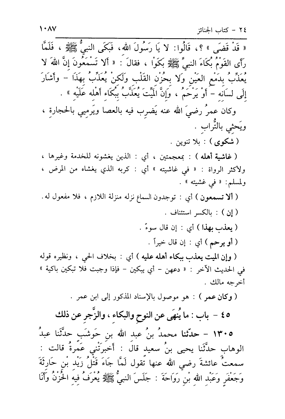 «قَدْ قَضَى» قَالُوا: لاَ يَا رَسُولَ اللَّهِ، فَبَكَى النَّبِيُّ صَلَّى اللهُ عَلَيْهِ وَسَلَّمَ، فَلَمَّا رَأَى القَوْمُ بُكَاءَ النَّبِيِّ صَلَّى اللهُ عَلَيْهِ وَسَلَّمَ بَكَوْا، فَقَالَ: «أَلاَ تَسْمَعُونَ إِنَّ اللَّهَ لاَ يُعَذِّبُ بِدَمْعِ العَيْنِ، وَلاَ بِحُزْنِ القَلْبِ، وَلَكِنْ يُعَذِّبُ بِهَذَا - وَأَشَارَ إِلَى لِسَانِهِ - أَوْ يَرْحَمُ، وَإِنَّ المَيِّتَ يُعَذَّبُ بِبُكَاءِ أَهْلِهِ عَلَيْهِ» وَكَانَ عُمَرُ رَضِيَ اللَّهُ عَنْهُ: «يَضْرِبُ فِيهِ بِالعَصَا، وَيَرْمِي بِالحِجَارَةِ، وَيَحْثِي بِالتُّرَابِ».