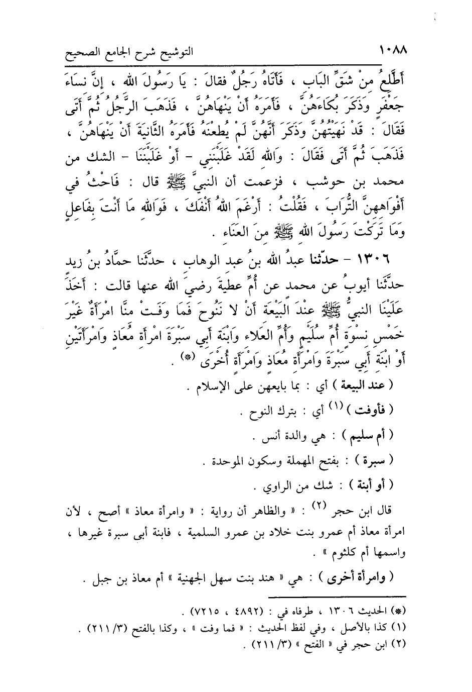1306 - حَدَّثَنَا عَبْدُ اللَّهِ بْنُ عَبْدِ الوَهَّابِ، حَدَّثَنَا حَمَّادُ بْنُ زَيْدٍ، حَدَّثَنَا أَيُّوبُ، عَنْ مُحَمَّدٍ، عَنْ أُمِّ عَطِيَّةَ رَضِيَ اللَّهُ عَنْهَا، قَالَتْ: «أَخَذَ عَلَيْنَا النَّبِيُّ صَلَّى اللهُ عَلَيْهِ وَسَلَّمَ عِنْدَ البَيْعَةِ أَنْ لاَ نَنُوحَ»، فَمَا وَفَتْ مِنَّا امْرَأَةٌ غَيْرَ خَمْسِ نِسْوَةٍ: أُمِّ سُلَيْمٍ، وَأُمِّ العَلاَءِ، وَابْنَةِ أَبِي سَبْرَةَ امْرَأَةِ مُعَاذٍ، وَامْرَأَتَيْنِ - أَوِ ابْنَةِ أَبِي سَبْرَةَ، وَامْرَأَةِ مُعَاذٍ وَامْرَأَةٍ أُخْرَى -.