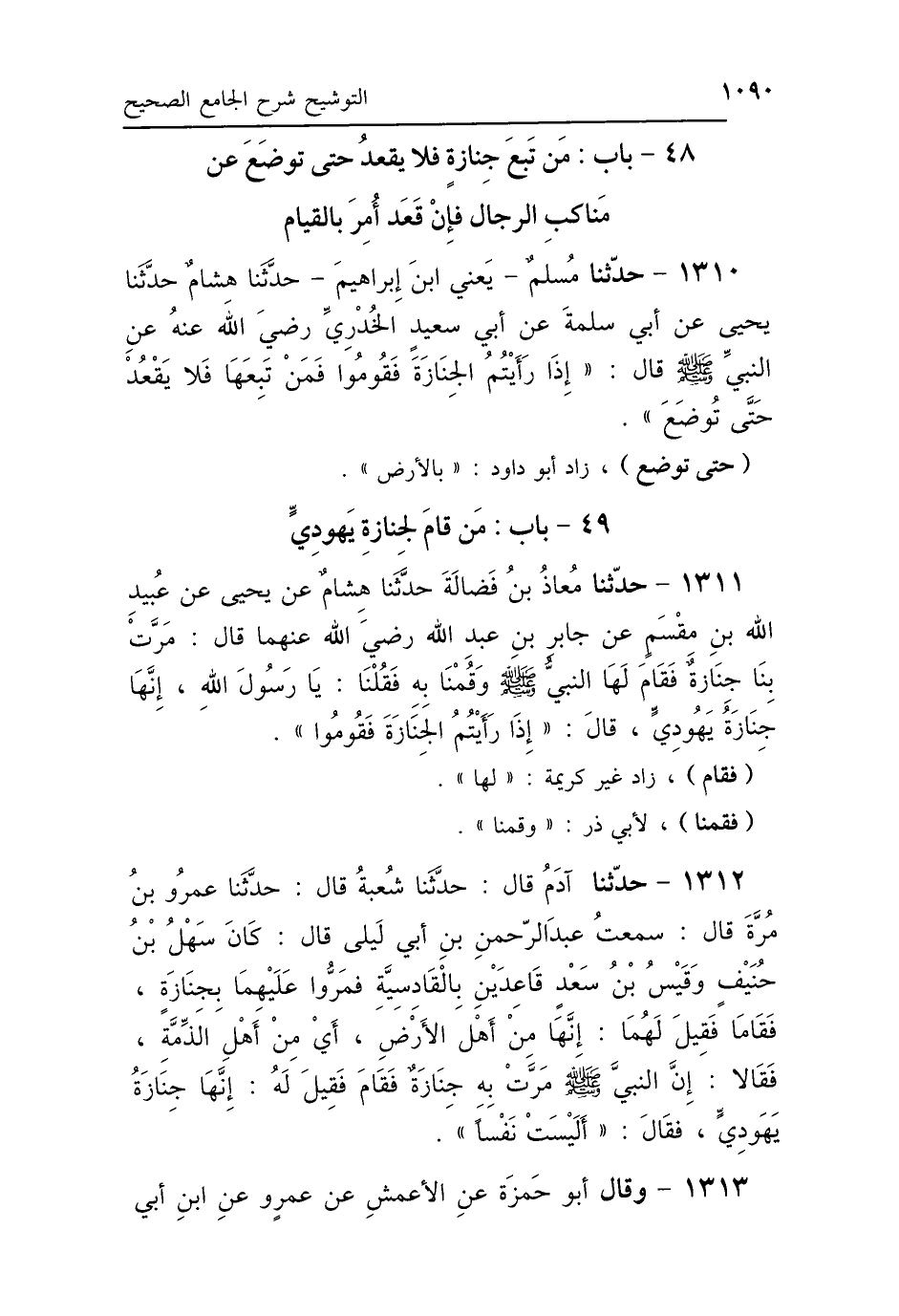 1312 - حَدَّثَنَا آدَمُ، حَدَّثَنَا شُعْبَةُ، حَدَّثَنَا عَمْرُو بْنُ مُرَّةَ، قَالَ: سَمِعْتُ عَبْدَ الرَّحْمَنِ بْنَ أَبِي لَيْلَى، قَالَ: كَانَ سَهْلُ بْنُ حُنَيْفٍ، وَقَيْسُ بْنُ سَعْدٍ قَاعِدَيْنِ بِالقَادِسِيَّةِ، فَمَرُّوا عَلَيْهِمَا بِجَنَازَةٍ، فَقَامَا، فَقِيلَ لَهُمَا إِنَّهَا مِنْ أَهْلِ الأَرْضِ أَيْ مِنْ أَهْلِ الذِّمَّةِ، فَقَالاَ: إِنَّ النَّبِيَّ صَلَّى اللهُ عَلَيْهِ وَسَلَّمَ مَرَّتْ بِهِ جِنَازَةٌ فَقَامَ، فَقِيلَ لَهُ: إِنَّهَا جِنَازَةُ يَهُودِيٍّ، فَقَالَ: «أَلَيْسَتْ نَفْسًا».