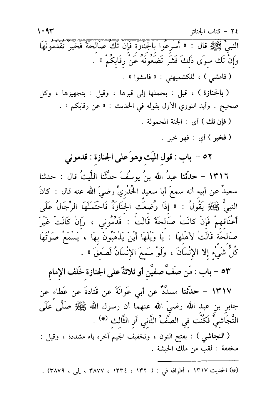 1317 - حَدَّثَنَا مُسَدَّدٌ، عَنْ أَبِي عَوَانَةَ، عَنْ قَتَادَةَ، عَنْ عَطَاءٍ، عَنْ جَابِرِ بْنِ عَبْدِ اللَّهِ رَضِيَ اللَّهُ عَنْهُمَا: «أَنَّ رَسُولَ اللَّهِ صَلَّى اللهُ عَلَيْهِ وَسَلَّمَ صَلَّى عَلَى النَّجَاشِيِّ، فَكُنْتُ فِي الصَّفِّ الثَّانِي أَوِ الثَّالِثِ».