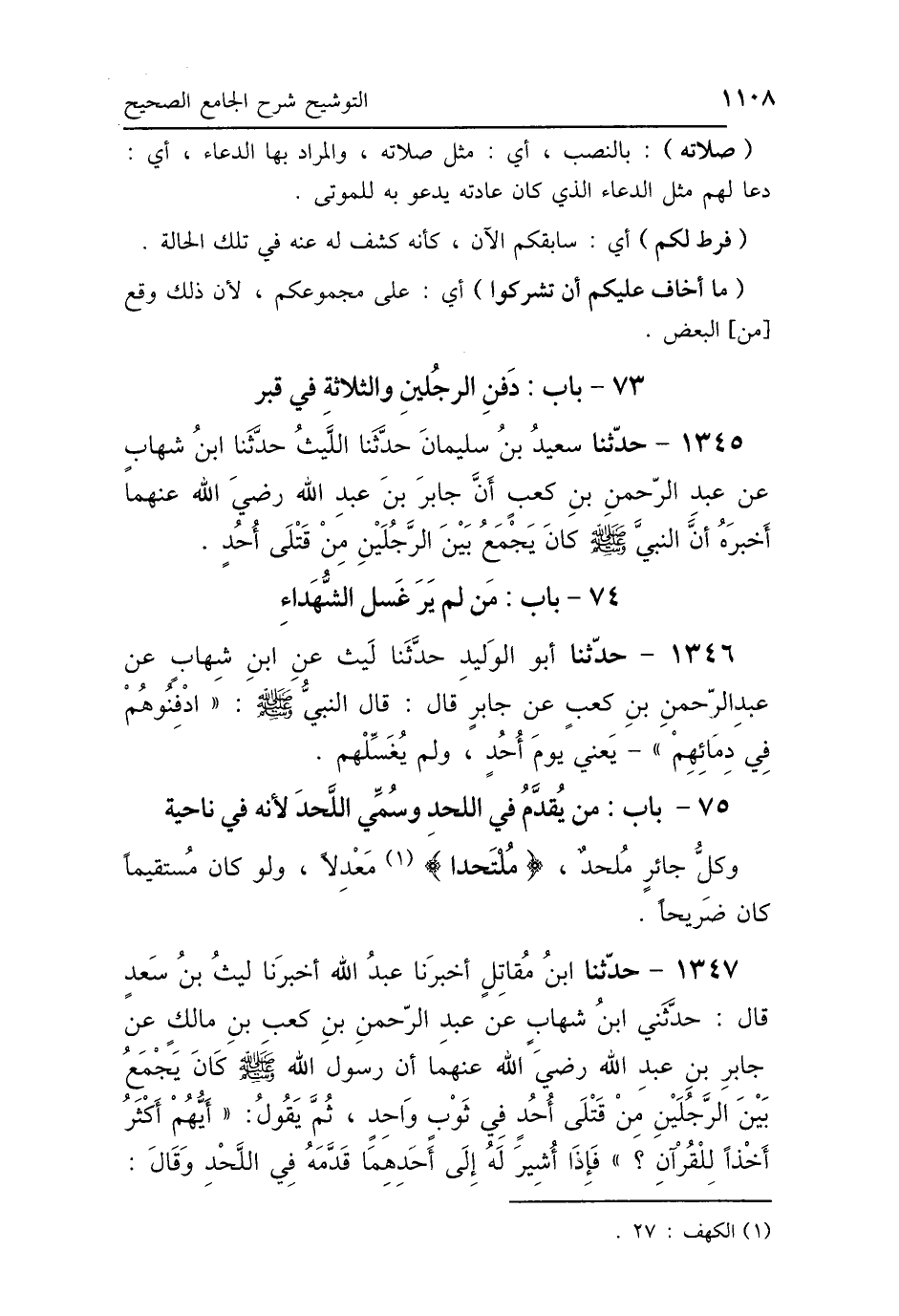 1345 - حَدَّثَنَا سَعِيدُ بْنُ سُلَيْمَانَ، حَدَّثَنَا اللَّيْثُ، حَدَّثَنَا ابْنُ شِهَابٍ، عَنْ عَبْدِ الرَّحْمَنِ بْنِ كَعْبٍ، أَنَّ جَابِرَ بْنَ عَبْدِ اللَّهِ رَضِيَ اللَّهُ عَنْهُمَا أَخْبَرَهُ: «أَنَّ النَّبِيَّ صَلَّى اللهُ عَلَيْهِ وَسَلَّمَ كَانَ يَجْمَعُ بَيْنَ الرَّجُلَيْنِ مِنْ قَتْلَى أُحُدٍ».