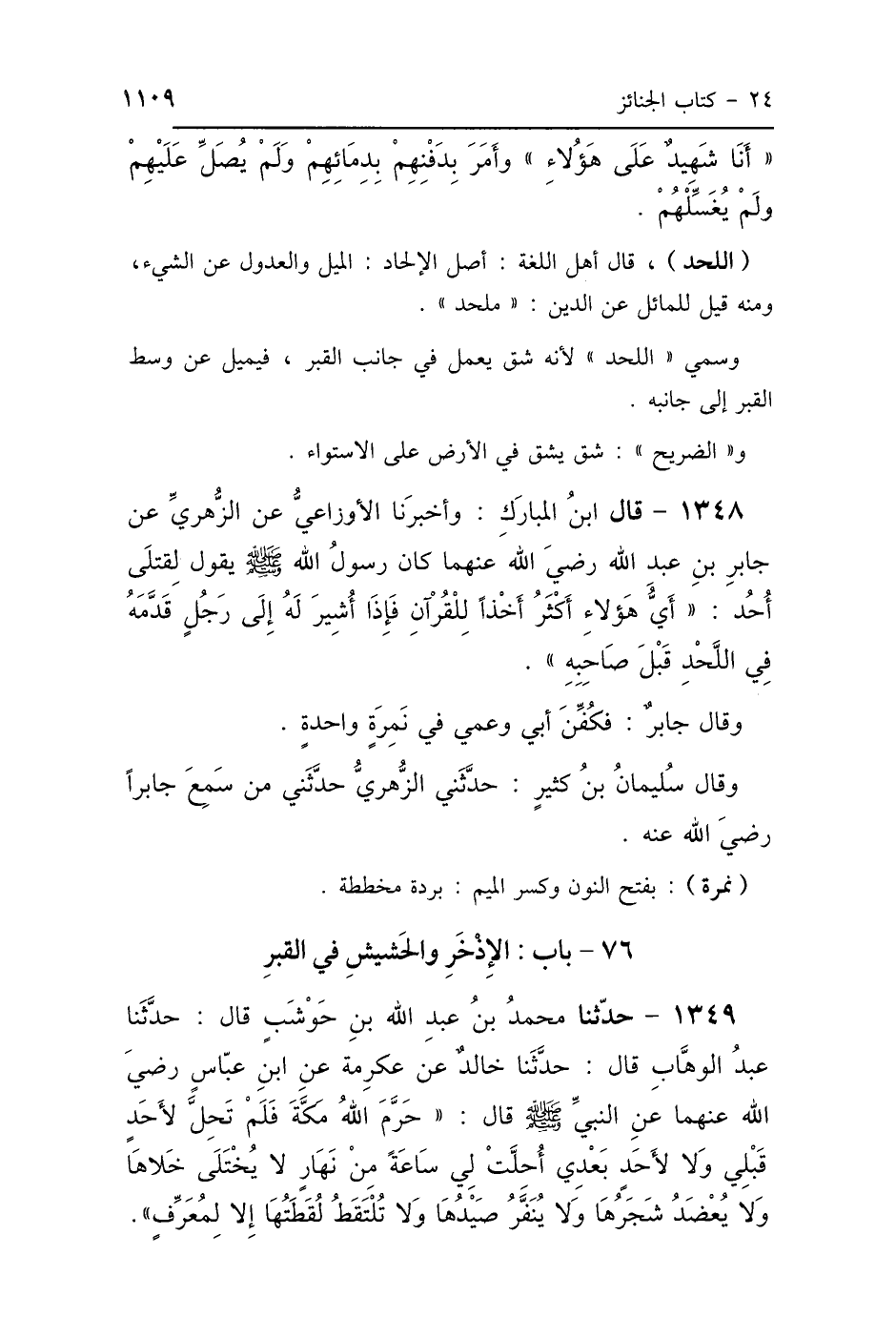 1348 - وَأَخْبَرَنَا ابْنُ المُبَارَكِ، أَخْبَرَنَا الأَوْزَاعِيُّ، عَنِ الزُّهْرِيِّ، عَنْ جَابِرِ بْنِ عَبْدِ اللَّهِ رَضِيَ اللَّهُ عَنْهُمَا، كَانَ رَسُولُ اللَّهِ صَلَّى اللهُ عَلَيْهِ وَسَلَّمَ يَقُولُ لِقَتْلَى أُحُدٍ: «أَيُّ هَؤُلاَءِ أَكْثَرُ أَخْذًا لِلْقُرْآنِ؟» فَإِذَا أُشِيرَ لَهُ إِلَى رَجُلٍ قَدَّمَهُ فِي اللَّحْدِ قَبْلَ صَاحِبِهِ، وَقَالَ جَابِرٌ: فَكُفِّنَ أَبِي وَعَمِّي فِي نَمِرَةٍ وَاحِدَةٍ، وَقَالَ سُلَيْمَانُ بْنُ كَثِيرٍ: حَدَّثَنِي الزُّهْرِيُّ، حَدَّثَنِي مَنْ سَمِعَ جَابِرًا رَضِيَ اللَّهُ عَنْهُ.