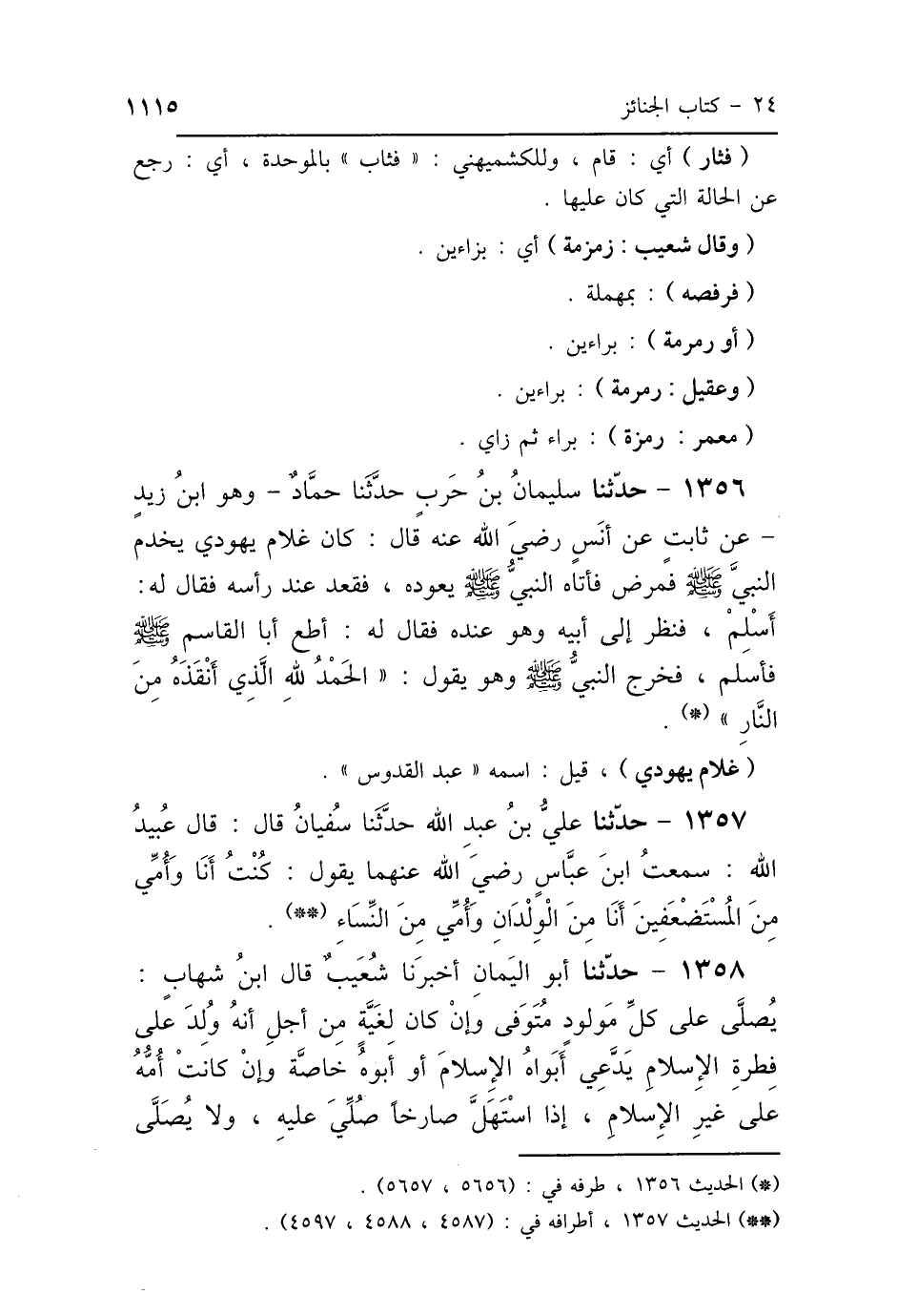1356 - حَدَّثَنَا سُلَيْمَانُ بْنُ حَرْبٍ، حَدَّثَنَا حَمَّادٌ وَهْوَ ابْنُ زَيْدٍ، عَنْ ثَابِتٍ، عَنْ أَنَسٍ رَضِيَ اللَّهُ عَنْهُ، قَالَ: كَانَ غُلاَمٌ يَهُودِيٌّ يَخْدُمُ النَّبِيَّ صَلَّى اللهُ عَلَيْهِ وَسَلَّمَ، فَمَرِضَ، فَأَتَاهُ النَّبِيُّ صَلَّى اللهُ عَلَيْهِ وَسَلَّمَ يَعُودُهُ، فَقَعَدَ عِنْدَ رَأْسِهِ، فَقَالَ لَهُ: «أَسْلِمْ»، فَنَظَرَ إِلَى أَبِيهِ وَهُوَ عِنْدَهُ فَقَالَ لَهُ: أَطِعْ أَبَا القَاسِمِ صَلَّى اللهُ عَلَيْهِ وَسَلَّمَ، فَأَسْلَمَ، فَخَرَجَ النَّبِيُّ صَلَّى اللهُ عَلَيْهِ وَسَلَّمَ وَهُوَ يَقُولُ: «الحَمْدُ لِلَّهِ الَّذِي أَنْقَذَهُ مِنَ النَّارِ».