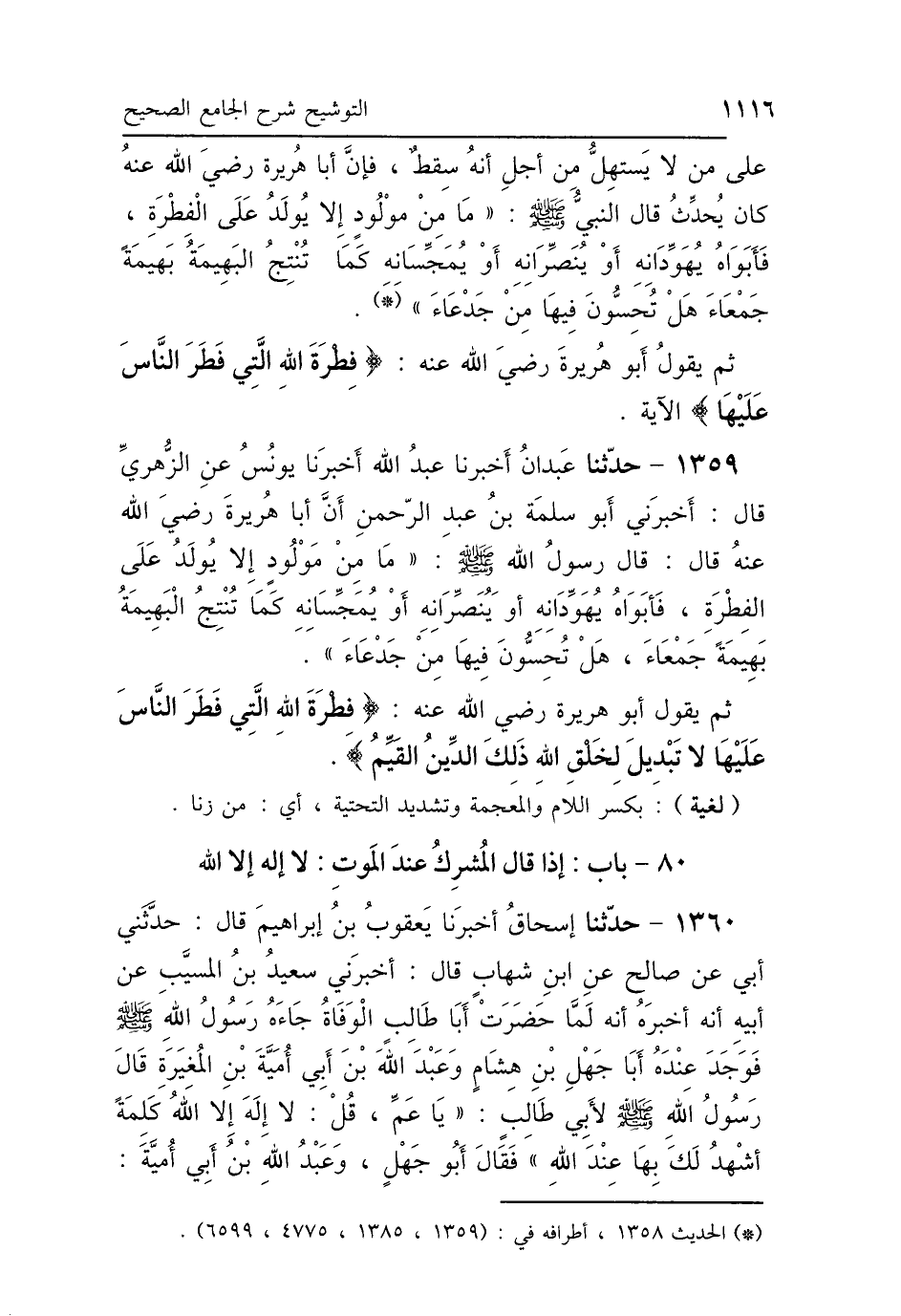 عَلَى مَنْ لاَ يَسْتَهِلُّ مِنْ أَجْلِ أَنَّهُ سِقْطٌ» فَإِنَّ أَبَا هُرَيْرَةَ رَضِيَ اللَّهُ عَنْهُ، كَانَ يُحَدِّثُ، قَالَ النَّبِيُّ صَلَّى اللهُ عَلَيْهِ وَسَلَّمَ: «مَا مِنْ مَوْلُودٍ إِلَّا يُولَدُ عَلَى الفِطْرَةِ، فَأَبَوَاهُ يُهَوِّدَانِهِ أَوْ يُنَصِّرَانِهِ، أَوْ يُمَجِّسَانِهِ، كَمَا تُنْتَجُ البَهِيمَةُ بَهِيمَةً جَمْعَاءَ، هَلْ تُحِسُّونَ فِيهَا مِنْ جَدْعَاءَ»، ثُمَّ يَقُولُ أَبُو هُرَيْرَةَ رَضِيَ اللَّهُ عَنْهُ: {فِطْرَةَ اللَّهِ الَّتِي فَطَرَ النَّاسَ عَلَيْهَا} [الروم: 30] الآيَةَ.