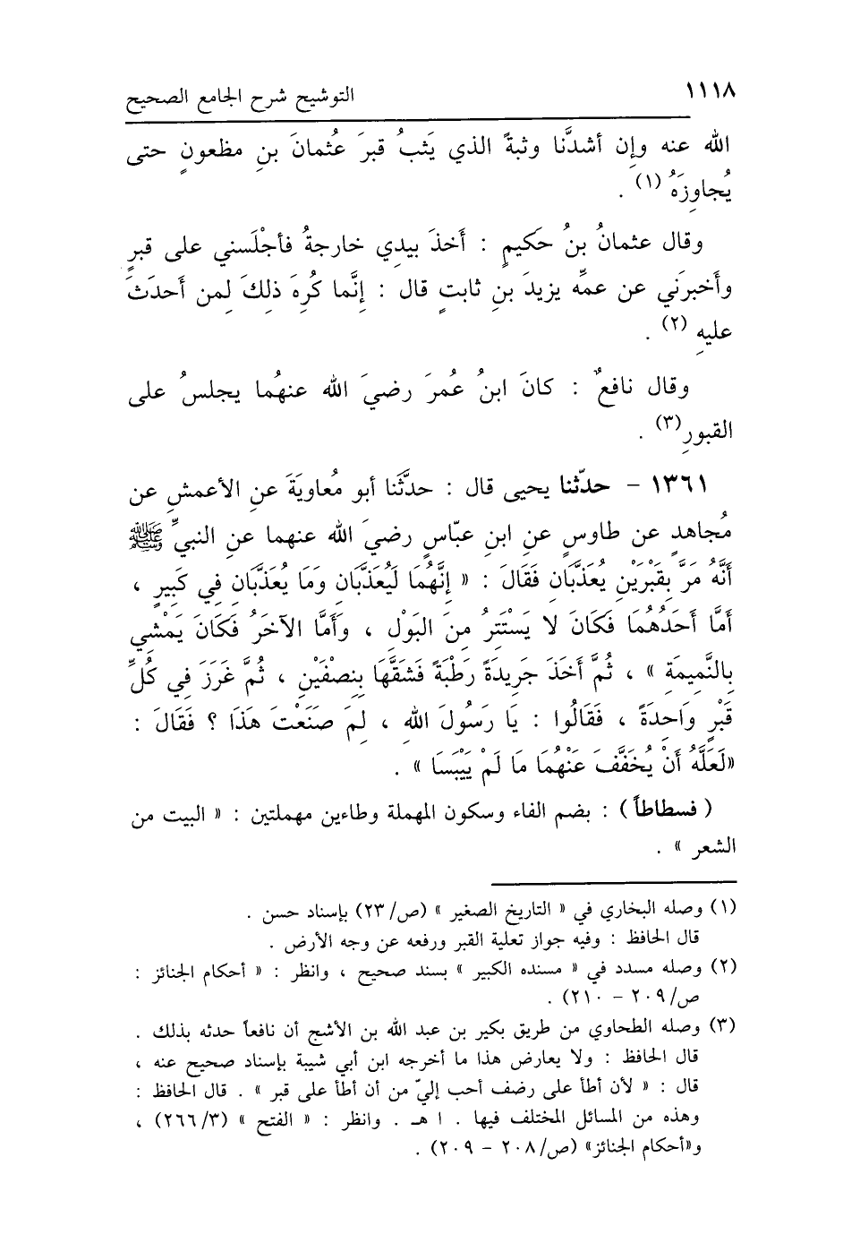 1361 - حَدَّثَنَا يَحْيَى، حَدَّثَنَا أَبُو مُعَاوِيَةَ، عَنِ الأَعْمَشِ، عَنْ مُجَاهِدٍ، عَنْ طَاوُسٍ، عَنِ ابْنِ عَبَّاسٍ رَضِيَ اللَّهُ عَنْهُمَا، عَنِ النَّبِيِّ صَلَّى اللهُ عَلَيْهِ وَسَلَّمَ: أَنَّهُ مَرَّ بِقَبْرَيْنِ يُعَذَّبَانِ، فَقَالَ: «إِنَّهُمَا لَيُعَذَّبَانِ، وَمَا يُعَذَّبَانِ فِي كَبِيرٍ، أَمَّا أَحَدُهُمَا فَكَانَ لاَ يَسْتَتِرُ مِنَ البَوْلِ، وَأَمَّا الآخَرُ فَكَانَ يَمْشِي بِالنَّمِيمَةِ»، ثُمَّ أَخَذَ جَرِيدَةً رَطْبَةً، فَشَقَّهَا بِنِصْفَيْنِ، ثُمَّ غَرَزَ فِي كُلِّ قَبْرٍ وَاحِدَةً، فَقَالُوا: يَا رَسُولَ اللَّهِ، لِمَ صَنَعْتَ هَذَا؟ فَقَالَ: «لَعَلَّهُ أَنْ يُخَفَّفَ عَنْهُمَا مَا لَمْ يَيْبَسَا».