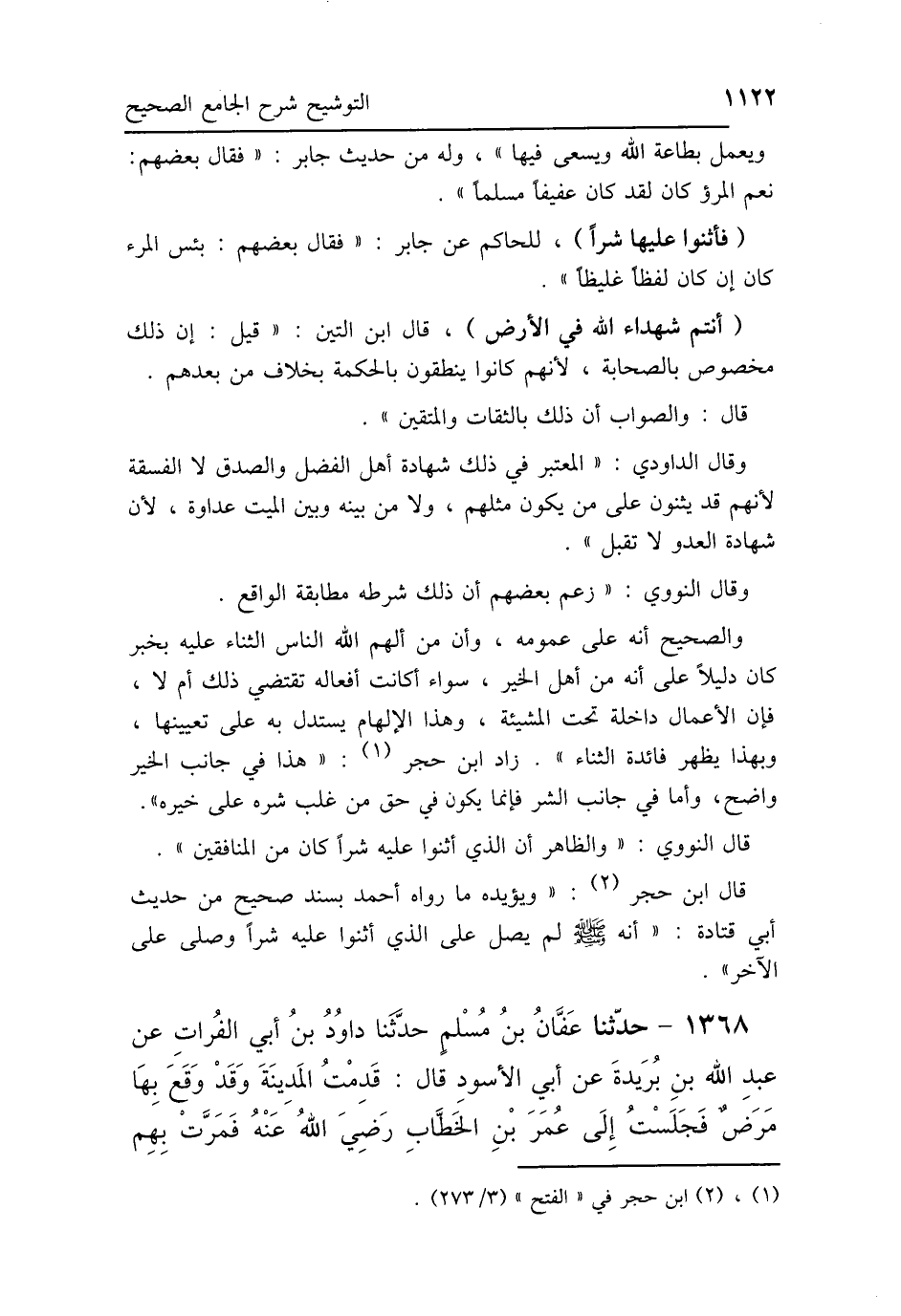 (أنتم شهداء الله في الأرض)، قال ابن التين: "قيل: إن ذلك مخصوص بالصحابة، لأنّهم كانوا ينطقون بالحكمة بخلاف من بعدهم.
