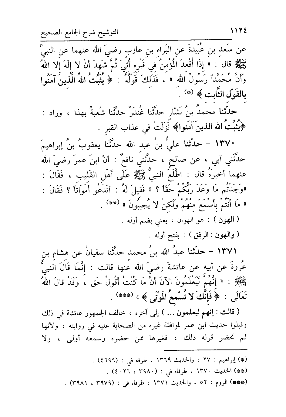 1371 - حَدَّثَنَا عَبْدُ اللَّهِ بْنُ مُحَمَّدٍ، حَدَّثَنَا سُفْيَانُ، عَنْ هِشَامِ بْنِ عُرْوَةَ، عَنْ أَبِيهِ، عَنْ عَائِشَةَ رَضِيَ اللَّهُ عَنْهَا، قَالَتْ: إِنَّمَا قَالَ النَّبِيُّ صَلَّى اللهُ عَلَيْهِ وَسَلَّمَ: «إِنَّهُمْ لَيَعْلَمُونَ الآنَ أَنَّ مَا كُنْتُ أَقُولُ لَهُمْ حَقٌّ» وَقَدْ قَالَ اللَّهُ تَعَالَى: {إِنَّكَ لاَ تُسْمِعُ المَوْتَى} [النمل: 80].