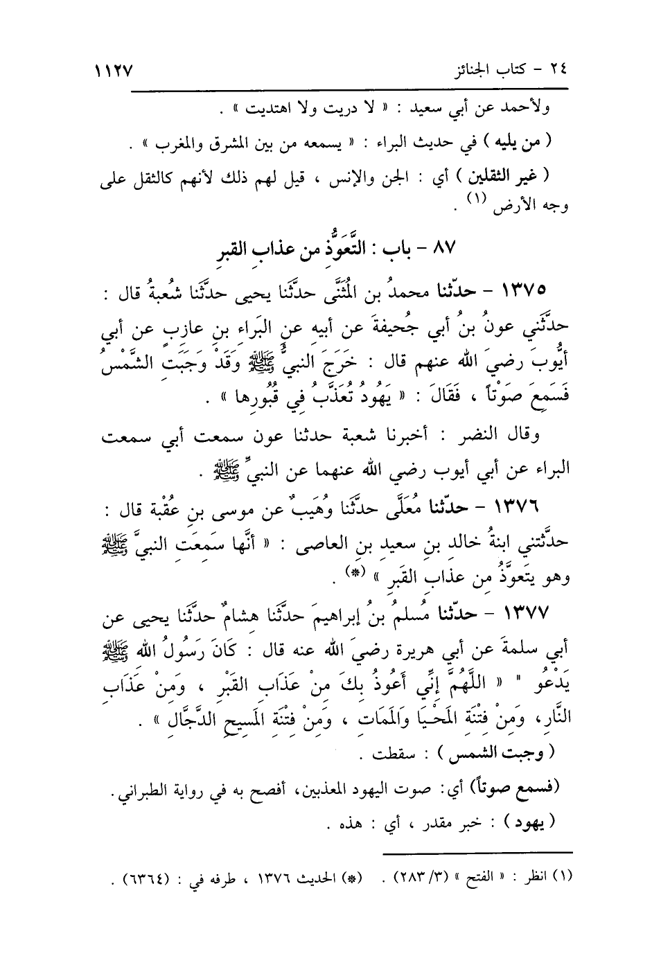 1375 - حَدَّثَنَا مُحَمَّدُ بْنُ المُثَنَّى، حَدَّثَنَا يَحْيَى، حَدَّثَنَا شُعْبَةُ، قَالَ: حَدَّثَنِي عَوْنُ بْنُ أَبِي جُحَيْفَةَ، عَنْ أَبِيهِ، عَنِ البَرَاءِ بْنِ عَازِبٍ، عَنْ أَبِي أَيُّوبَ رَضِيَ اللَّهُ عَنْهُمْ، قَالَ: خَرَجَ النَّبِيُّ صَلَّى اللهُ عَلَيْهِ وَسَلَّمَ وَقَدْ وَجَبَتِ الشَّمْسُ، فَسَمِعَ صَوْتًا فَقَالَ: «يَهُودُ تُعَذَّبُ فِي قُبُورِهَا» وَقَالَ النَّضْرُ: أَخْبَرَنَا شُعْبَةُ، حَدَّثَنَا عَوْنٌ، سَمِعْتُ أَبِي، سَمِعْتُ البَرَاءَ، عَنْ أَبِي أَيُّوبَ رَضِيَ اللَّهُ عَنْهُمَا، عَنِ النَّبِيِّ صَلَّى اللهُ عَلَيْهِ وَسَلَّمَ.