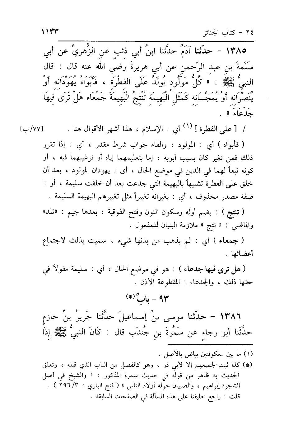 1385 - حَدَّثَنَا آدَمُ، حَدَّثَنَا ابْنُ أَبِي ذِئْبٍ، عَنِ الزُّهْرِيِّ، عَنْ أَبِي سَلَمَةَ بْنِ عَبْدِ الرَّحْمَنِ، عَنْ أَبِي هُرَيْرَةَ رَضِيَ اللَّهُ عَنْهُ، قَالَ: قَالَ النَّبِيُّ صَلَّى اللهُ عَلَيْهِ وَسَلَّمَ: «كُلُّ مَوْلُودٍ يُولَدُ عَلَى الفِطْرَةِ، فَأَبَوَاهُ يُهَوِّدَانِهِ، أَوْ يُنَصِّرَانِهِ، أَوْ يُمَجِّسَانِهِ، كَمَثَلِ البَهِيمَةِ تُنْتَجُ البَهِيمَةَ هَلْ تَرَى فِيهَا جَدْعَاءَ».