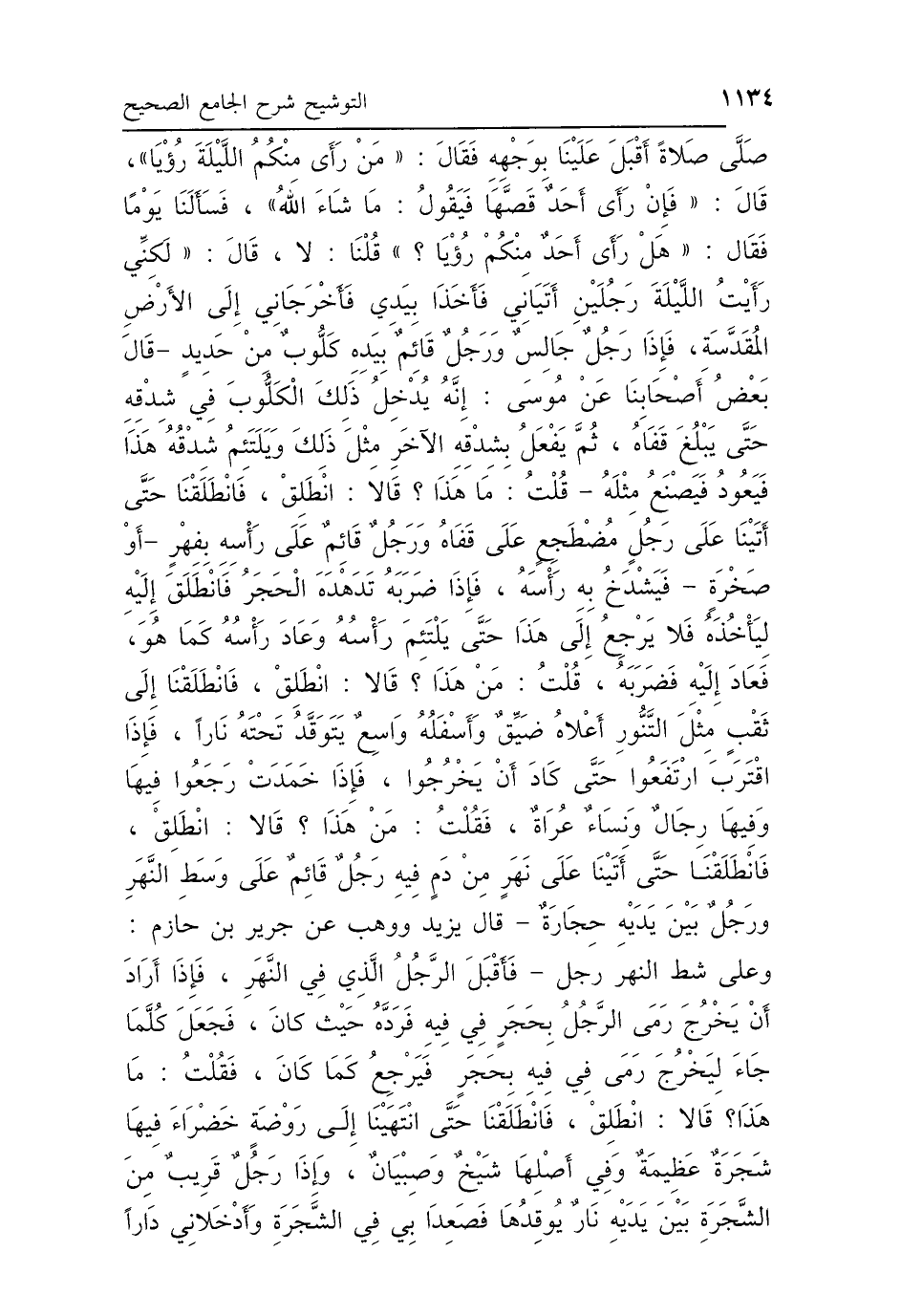 صَلَّى صَلاَةً أَقْبَلَ عَلَيْنَا بِوَجْهِهِ فَقَالَ: «مَنْ رَأَى مِنْكُمُ اللَّيْلَةَ رُؤْيَا؟» قَالَ: فَإِنْ رَأَى أَحَدٌ قَصَّهَا، فَيَقُولُ: «مَا شَاءَ اللَّهُ» فَسَأَلَنَا يَوْمًا فَقَالَ: «هَلْ رَأَى أَحَدٌ مِنْكُمْ رُؤْيَا؟» قُلْنَا: لاَ، قَالَ: «لَكِنِّي رَأَيْتُ اللَّيْلَةَ رَجُلَيْنِ أَتَيَانِي فَأَخَذَا بِيَدِي، فَأَخْرَجَانِي إِلَى الأَرْضِ المُقَدَّسَةِ، فَإِذَا رَجُلٌ جَالِسٌ، وَرَجُلٌ قَائِمٌ، بِيَدِهِ كَلُّوبٌ مِنْ حَدِيدٍ» قَالَ بَعْضُ أَصْحَابِنَا عَنْ مُوسَى: " إِنَّهُ يُدْخِلُ ذَلِكَ الكَلُّوبَ فِي شِدْقِهِ حَتَّى يَبْلُغَ قَفَاهُ، ثُمَّ يَفْعَلُ بِشِدْقِهِ الآخَرِ مِثْلَ ذَلِكَ، وَيَلْتَئِمُ شِدْقُهُ هَذَا، فَيَعُودُ فَيَصْنَعُ مِثْلَهُ، قُلْتُ: مَا هَذَا؟ قَالاَ: انْطَلِقْ، فَانْطَلَقْنَا حَتَّى أَتَيْنَا عَلَى رَجُلٍ مُضْطَجِعٍ عَلَى قَفَاهُ وَرَجُلٌ قَائِمٌ عَلَى رَأْسِهِ بِفِهْرٍ - أَوْ صَخْرَةٍ - فَيَشْدَخُ بِهِ رَأْسَهُ، فَإِذَا ضَرَبَهُ تَدَهْدَهَ الحَجَرُ، فَانْطَلَقَ إِلَيْهِ لِيَأْخُذَهُ، فَلاَ يَرْجِعُ إِلَى هَذَا حَتَّى يَلْتَئِمَ رَأْسُهُ وَعَادَ رَأْسُهُ كَمَا هُوَ، فَعَادَ إِلَيْهِ، فَضَرَبَهُ، قُلْتُ: مَنْ هَذَا؟ قَالاَ: انْطَلِقْ فَانْطَلَقْنَا إِلَى ثَقْبٍ مِثْلِ التَّنُّورِ، أَعْلاَهُ ضَيِّقٌ وَأَسْفَلُهُ وَاسِعٌ يَتَوَقَّدُ تَحْتَهُ نَارًا، فَإِذَا اقْتَرَبَ ارْتَفَعُوا حَتَّى كَادَ أَنْ يَخْرُجُوا، فَإِذَا خَمَدَتْ رَجَعُوا فِيهَا، وَفِيهَا رِجَالٌ وَنِسَاءٌ عُرَاةٌ، فَقُلْتُ: مَنْ هَذَا؟ قَالاَ: انْطَلِقْ، فَانْطَلَقْنَا حَتَّى أَتَيْنَا عَلَى نَهَرٍ مِنْ دَمٍ فِيهِ رَجُلٌ قَائِمٌ عَلَى وَسَطِ النَّهَرِ - قَالَ يَزِيدُ، وَوَهْبُ بْنُ جَرِيرٍ: عَنْ جَرِيرِ بْنِ حَازِمٍ - وَعَلَى شَطِّ النَّهَرِ رَجُلٌ بَيْنَ يَدَيْهِ حِجَارَةٌ، فَأَقْبَلَ الرَّجُلُ الَّذِي فِي النَّهَرِ، فَإِذَا أَرَادَ أَنْ يَخْرُجَ رَمَى الرَّجُلُ بِحَجَرٍ فِي فِيهِ، فَرَدَّهُ حَيْثُ كَانَ، فَجَعَلَ كُلَّمَا جَاءَ لِيَخْرُجَ رَمَى فِي فِيهِ بِحَجَرٍ، فَيَرْجِعُ كَمَا كَانَ، فَقُلْتُ: مَا هَذَا؟ قَالاَ: انْطَلِقْ، فَانْطَلَقْنَا حَتَّى انْتَهَيْنَا إِلَى رَوْضَةٍ خَضْرَاءَ، فِيهَا شَجَرَةٌ عَظِيمَةٌ، وَفِي أَصْلِهَا شَيْخٌ وَصِبْيَانٌ، وَإِذَا رَجُلٌ قَرِيبٌ مِنَ الشَّجَرَةِ بَيْنَ يَدَيْهِ نَارٌ يُوقِدُهَا، فَصَعِدَا بِي فِي الشَّجَرَةِ، وَأَدْخَلاَنِي دَارًا