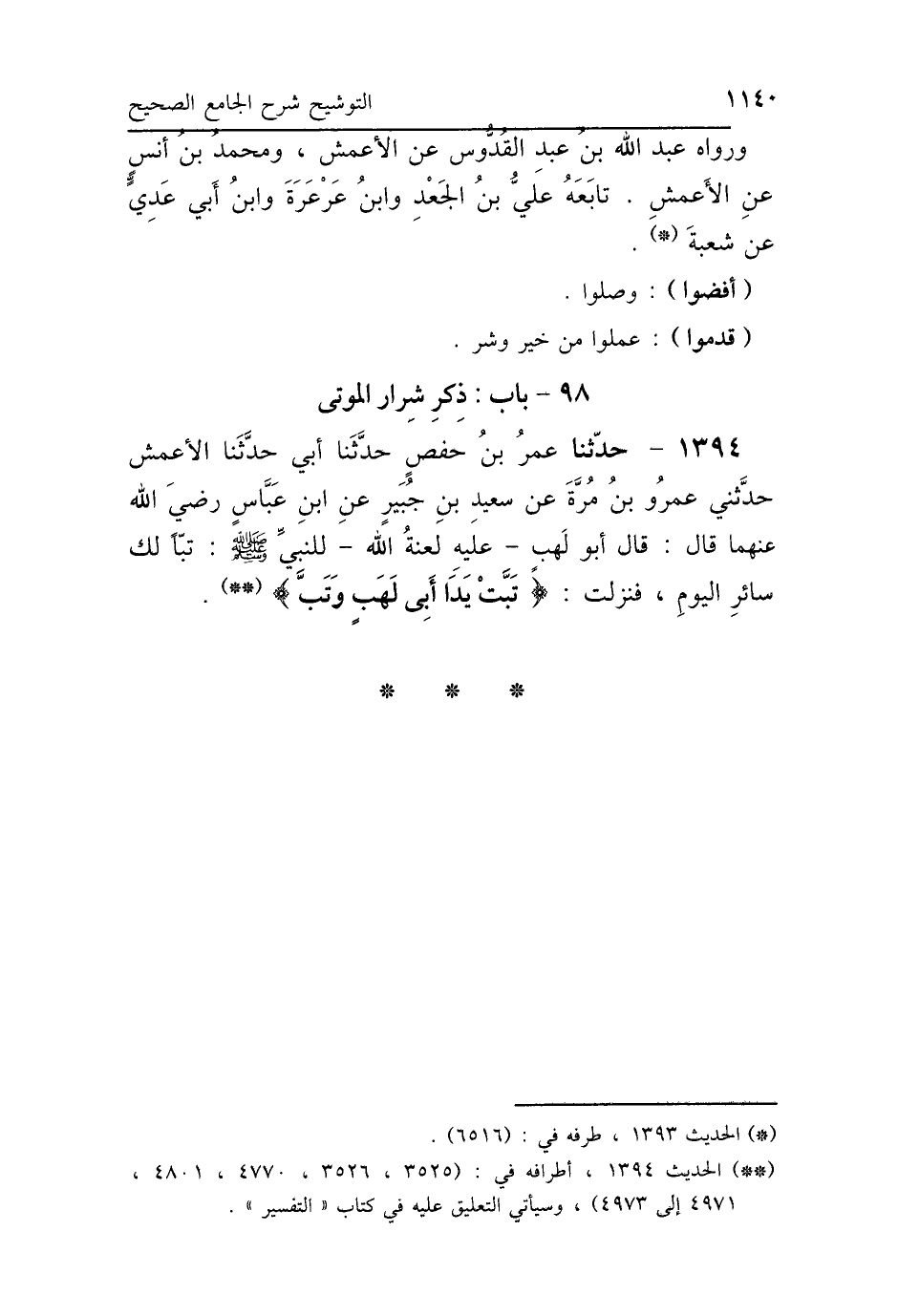 1394 - حَدَّثَنَا عُمَرُ بْنُ حَفْصٍ، حَدَّثَنَا أَبِي، حَدَّثَنَا الأَعْمَشُ، حَدَّثَنِي عَمْرُو بْنُ مُرَّةَ، عَنْ سَعِيدِ بْنِ جُبَيْرٍ، عَنِ ابْنِ عَبَّاسٍ رَضِيَ اللَّهُ عَنْهُمَا، قَالَ: " قَالَ أَبُو لَهَبٍ عَلَيْهِ لَعْنَةُ اللَّهِ لِلنَّبِيِّ صَلَّى اللهُ عَلَيْهِ وَسَلَّمَ: تَبًّا لَكَ سَائِرَ اليَوْمِ فَنَزَلَتْ: {تَبَّتْ يَدَا أَبِي لَهَبٍ وَتَبَّ} [المسد: 1] ".