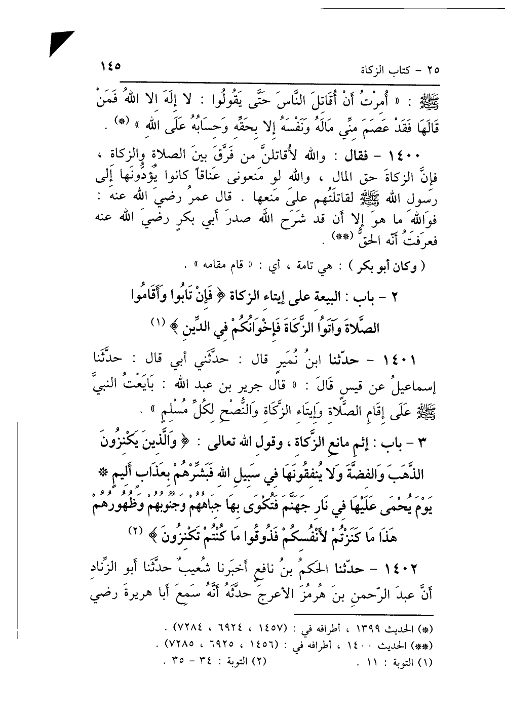 1400 - فَقَالَ: وَاللَّهِ لَأُقَاتِلَنَّ مَنْ فَرَّقَ بَيْنَ الصَّلاَةِ وَالزَّكَاةِ، فَإِنَّ الزَّكَاةَ حَقُّ المَالِ، وَاللَّهِ لَوْ مَنَعُونِي عَنَاقًا كَانُوا يُؤَدُّونَهَا إِلَى رَسُولِ اللَّهِ صَلَّى اللهُ عَلَيْهِ وَسَلَّمَ لَقَاتَلْتُهُمْ عَلَى مَنْعِهَا " قَالَ عُمَرُ رَضِيَ اللَّهُ عَنْهُ: «فَوَاللَّهِ مَا هُوَ إِلَّا أَنْ قَدْ شَرَحَ اللَّهُ صَدْرَ أَبِي بَكْرٍ رَضِيَ اللَّهُ عَنْهُ، فَعَرَفْتُ أَنَّهُ الحَقُّ».
