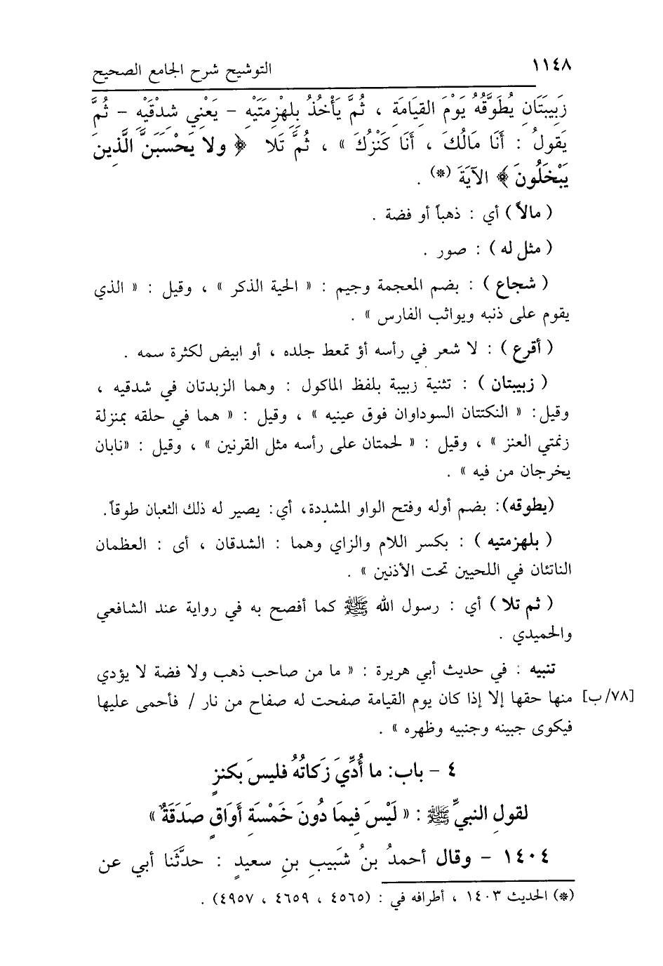 زَبِيبَتَانِ يُطَوَّقُهُ يَوْمَ القِيَامَةِ، ثُمَّ يَأْخُذُ بِلِهْزِمَتَيْهِ - يَعْنِي بِشِدْقَيْهِ - ثُمَّ يَقُولُ أَنَا مَالُكَ أَنَا كَنْزُكَ، ثُمَّ تَلاَ: (لَا يَحْسِبَنَّ الَّذِينَ يَبْخَلُونَ) " الآيَةَ.