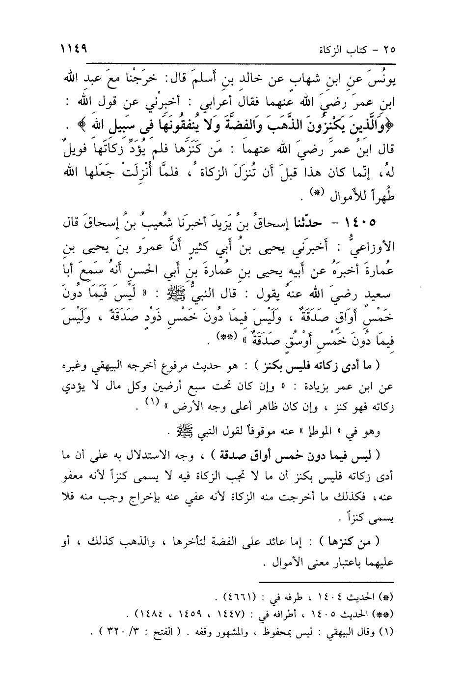 يُونُسَ، عَنِ ابْنِ شِهَابٍ، عَنْ خَالِدِ بْنِ أَسْلَمَ، قَالَ: خَرَجْنَا مَعَ عَبْدِ اللَّهِ بْنِ عُمَرَ رَضِيَ اللَّهُ عَنْهُمَا، فَقَالَ أَعْرَابِيٌّ: أَخْبِرْنِي عَنْ قَوْلِ اللَّهِ: {وَالَّذِينَ يَكْنِزُونَ الذَّهَبَ وَالفِضَّةَ، وَلاَ يُنْفِقُونَهَا فِي سَبِيلِ اللَّهِ} [التوبة: 34] قَالَ ابْنُ عُمَرَ رَضِيَ اللَّهُ عَنْهُمَا: «مَنْ كَنَزَهَا، فَلَمْ يُؤَدِّ زَكَاتَهَا، فَوَيْلٌ لَهُ، إِنَّمَا كَانَ هَذَا قَبْلَ أَنْ تُنْزَلَ الزَّكَاةُ، فَلَمَّا أُنْزِلَتْ جَعَلَهَا اللَّهُ طُهْرًا لِلْأَمْوَالِ».