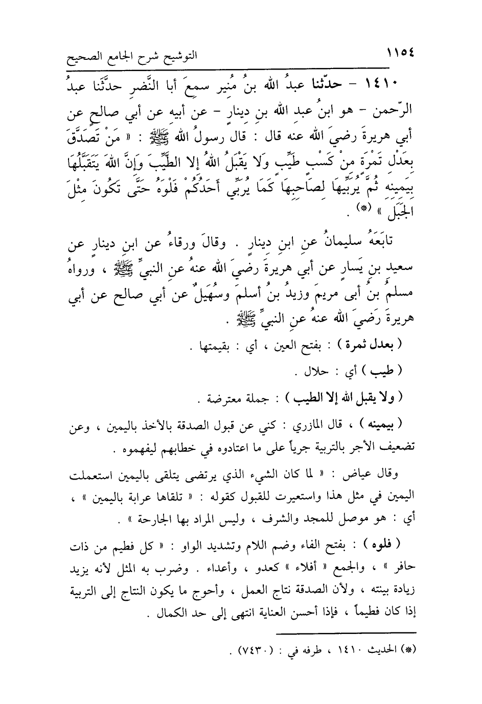 1410 - حَدَّثَنَا عَبْدُ اللَّهِ بْنُ مُنِيرٍ، سَمِعَ أَبَا النَّضْرِ، حَدَّثَنَا عَبْدُ الرَّحْمَنِ هُوَ ابْنُ عَبْدِ اللَّهِ بْنِ دِينَارٍ، عَنْ أَبِيهِ، عَنْ أَبِي صَالِحٍ، عَنْ أَبِي هُرَيْرَةَ رَضِيَ اللَّهُ عَنْهُ، قَالَ: قَالَ رَسُولُ اللَّهِ صَلَّى اللهُ عَلَيْهِ وَسَلَّمَ: «مَنْ تَصَدَّقَ بِعَدْلِ تَمْرَةٍ مِنْ كَسْبٍ طَيِّبٍ، وَلاَ يَقْبَلُ اللَّهُ إِلَّا الطَّيِّبَ، وَإِنَّ اللَّهَ يَتَقَبَّلُهَا بِيَمِينِهِ، ثُمَّ يُرَبِّيهَا لِصَاحِبِهِ، كَمَا يُرَبِّي أَحَدُكُمْ فَلُوَّهُ، حَتَّى تَكُونَ مِثْلَ الجَبَلِ» تَابَعَهُ سُلَيْمَانُ، عَنْ ابْنِ دِينَارٍ، وَقَالَ وَرْقَاءُ: عَنْ ابْنِ دِينَارٍ، عَنْ سَعِيدِ بْنِ يَسَارٍ، عَنْ أَبِي هُرَيْرَةَ رَضِيَ اللَّهُ عَنْهُ، عَنِ النَّبِيِّ صَلَّى اللهُ عَلَيْهِ وَسَلَّمَ، وَرَوَاهُ مُسْلِمُ بْنُ أَبِي مَرْيَمَ، وَزَيْدُ بْنُ أَسْلَمَ، وَسُهَيْلٌ، عَنْ أَبِي صَالِحٍ، عَنْ أَبِي هُرَيْرَةَ رَضِيَ اللَّهُ عَنْهُ، عَنِ النَّبِيِّ صَلَّى اللهُ عَلَيْهِ وَسَلَّمَ.