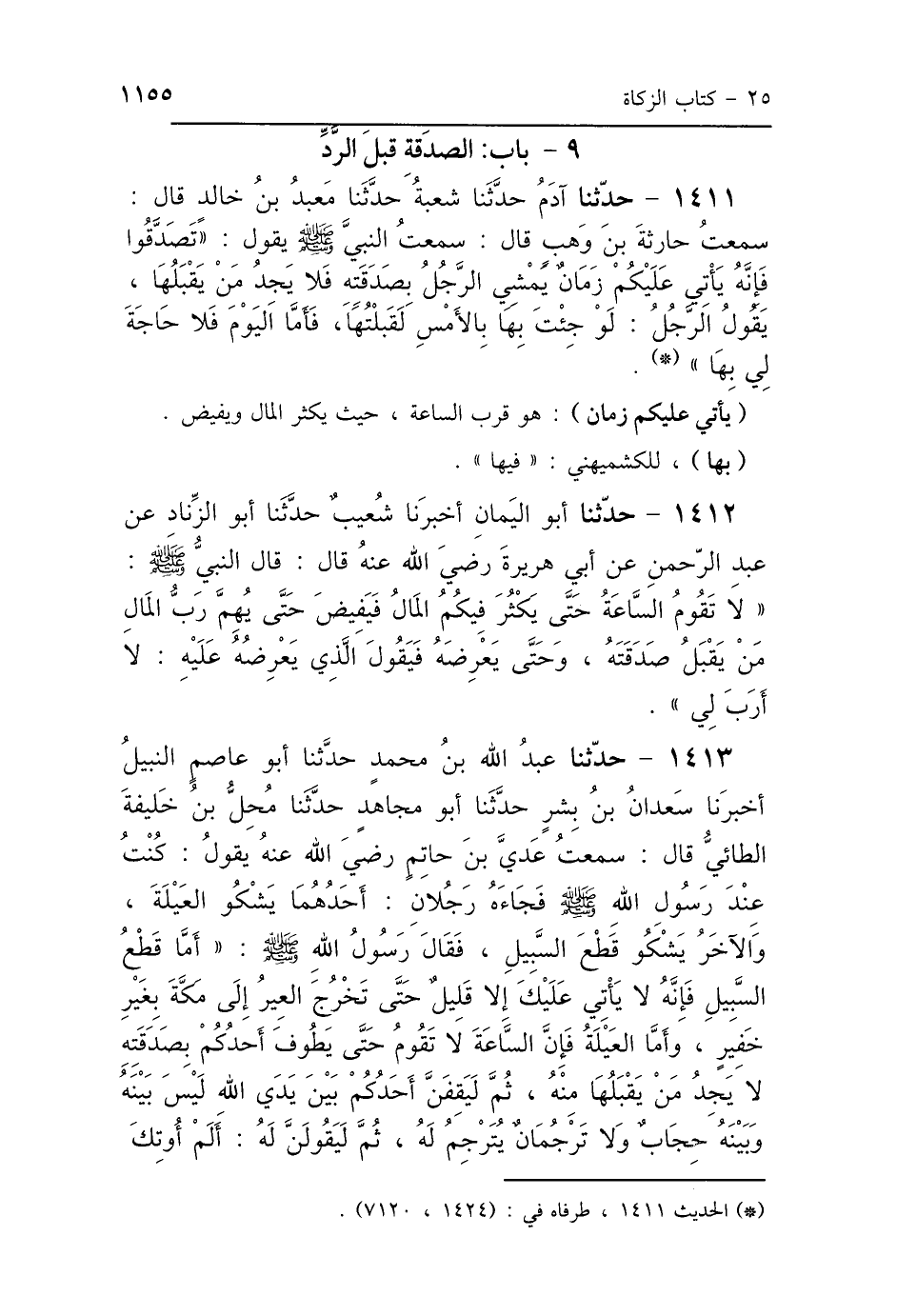 1412 - حَدَّثَنَا أَبُو اليَمَانِ، أَخْبَرَنَا شُعَيْبٌ، حَدَّثَنَا أَبُو الزِّنَادِ، عَنْ عَبْدِ الرَّحْمَنِ، عَنْ أَبِي هُرَيْرَةَ رَضِيَ اللَّهُ عَنْهُ، قَالَ: قَالَ النَّبِيُّ صَلَّى اللهُ عَلَيْهِ وَسَلَّمَ: " لاَ تَقُومُ السَّاعَةُ حَتَّى يَكْثُرَ فِيكُمُ المَالُ، فَيَفِيضَ حَتَّى يُهِمَّ رَبَّ المَالِ مَنْ يَقْبَلُ صَدَقَتَهُ، وَحَتَّى يَعْرِضَهُ، فَيَقُولَ الَّذِي يَعْرِضُهُ عَلَيْهِ: لاَ أَرَبَ لِي".