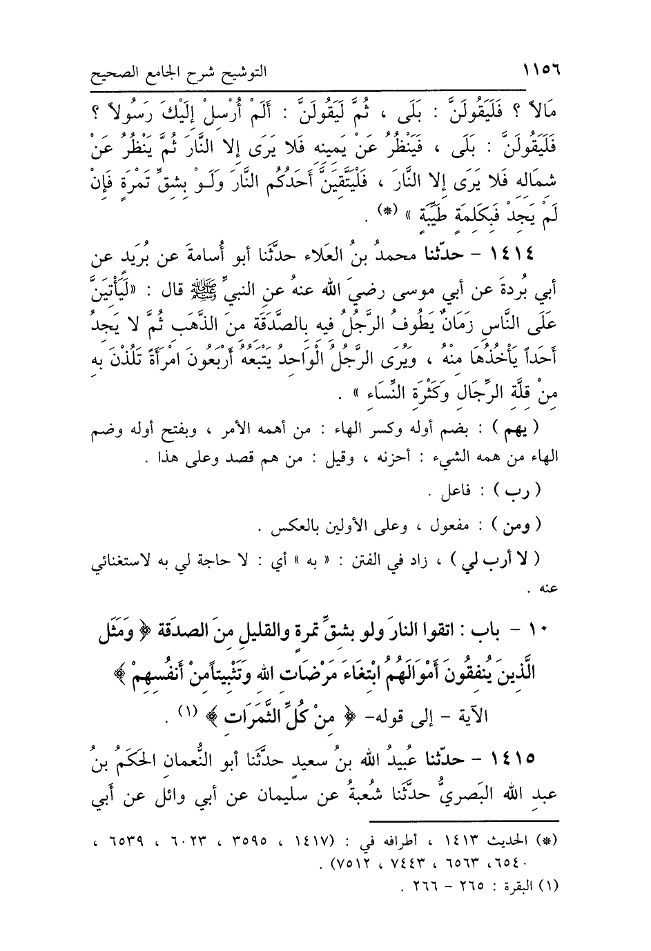 مَالًا؟ فَلَيَقُولَنَّ: بَلَى، ثُمَّ لَيَقُولَنَّ أَلَمْ أُرْسِلْ إِلَيْكَ رَسُولًا؟ فَلَيَقُولَنَّ: بَلَى، فَيَنْظُرُ عَنْ يَمِينِهِ فَلاَ يَرَى إِلَّا النَّارَ، ثُمَّ يَنْظُرُ عَنْ شِمَالِهِ فَلاَ يَرَى إِلَّا النَّارَ، فَلْيَتَّقِيَنَّ أَحَدُكُمُ النَّارَ وَلَوْ بِشِقِّ تَمْرَةٍ، فَإِنْ لَمْ يَجِدْ فَبِكَلِمَةٍ طَيِّبَةٍ".